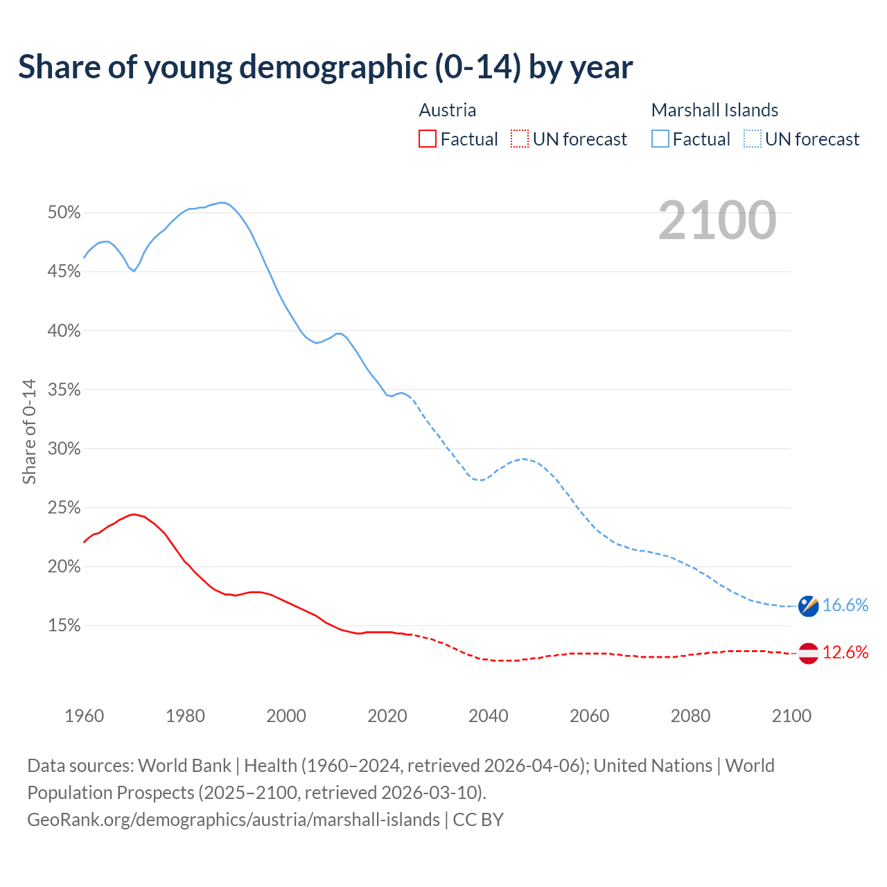 - The share of young demographic (0-15 years old) in Austria is 14.2% vs 34.5% in the Marshall Islands.