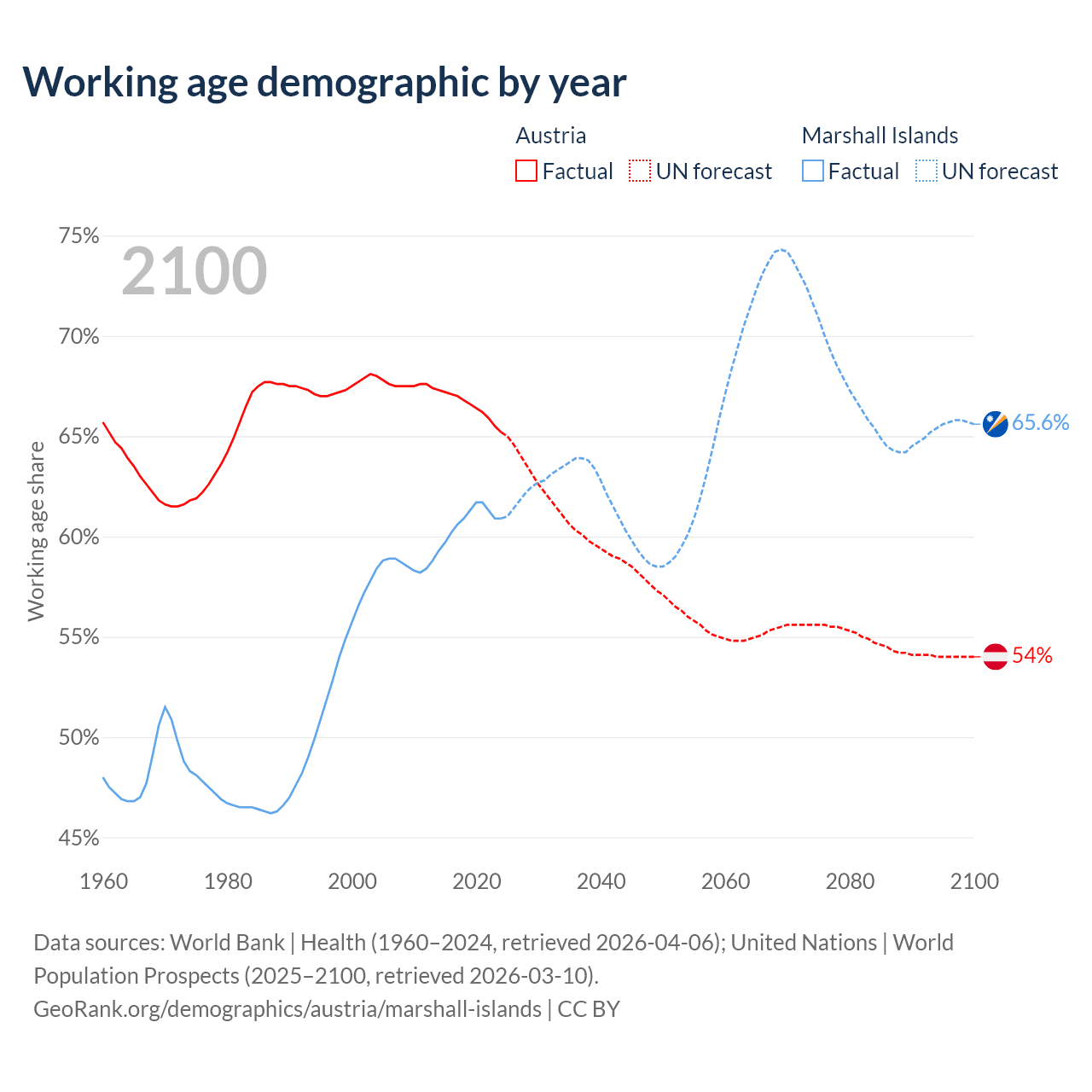 - Austria has 5.97M working age adults (aged 15-64) vs 21.3K in the Marshall Islands.
