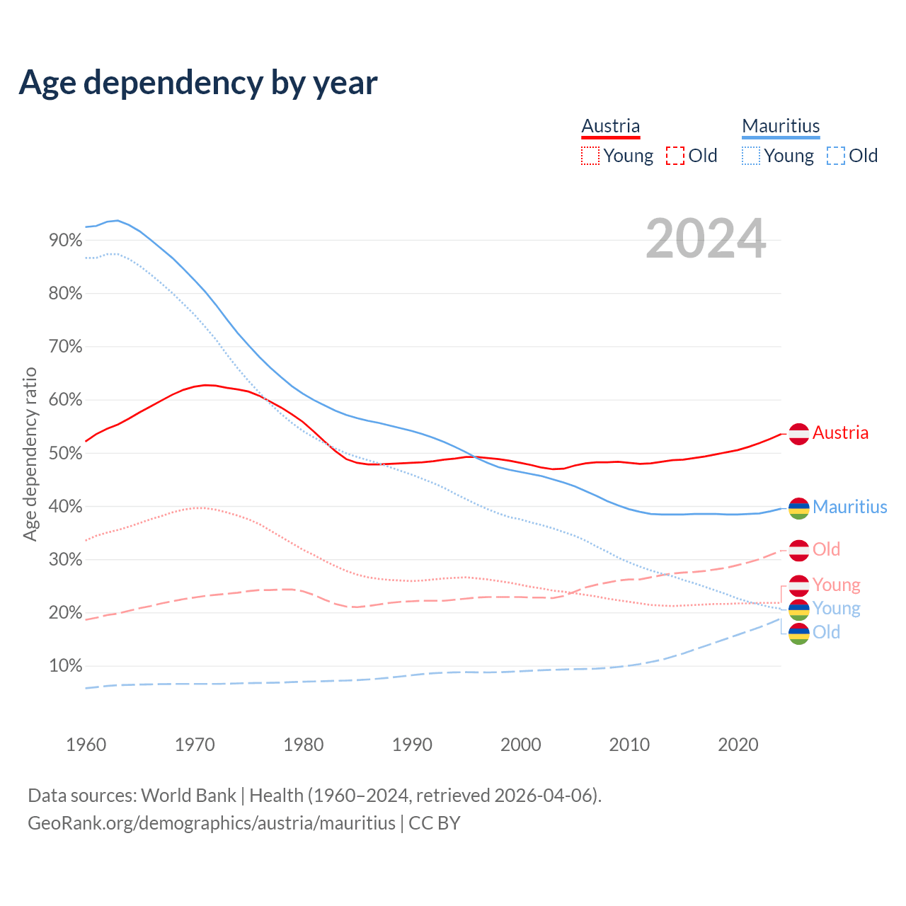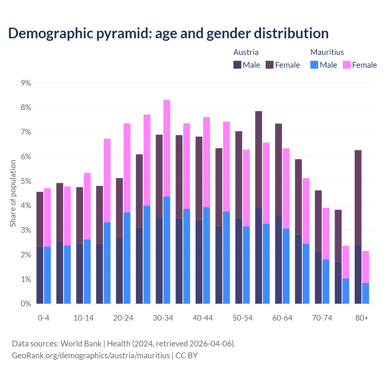 - The share of old-age demographic (65+) in Austria is 20.6% vs 13.5% in Mauritius.