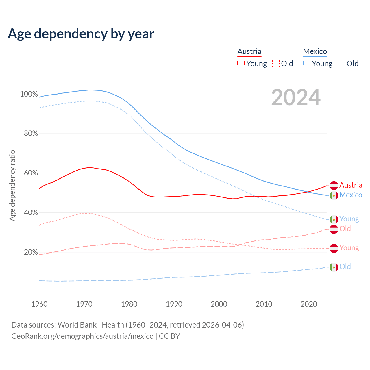 Data sources: World Bank | Health (1960–2024, retrieved 2026-04-06); U.S. Census Bureau (1960–2024, retrieved 2026-02-08).