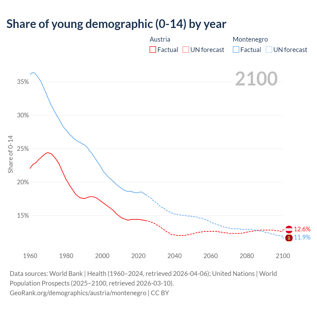 - The share of young demographic (0-15 years old) in Austria is 14.2% vs 18.1% in Montenegro.