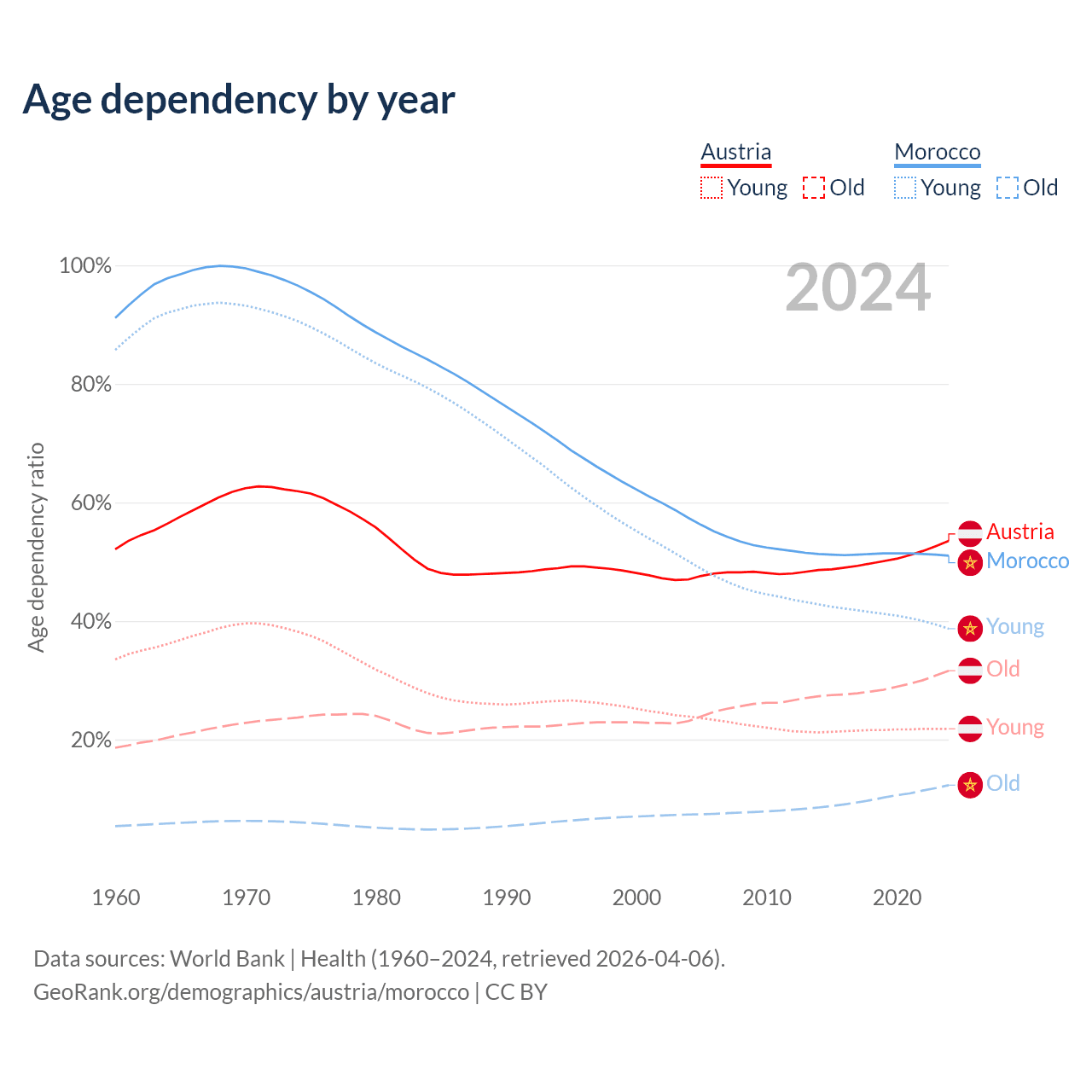 - Austria is ranked 19/196 by median age (oldest to youngest) vs 100/196 for Morocco.