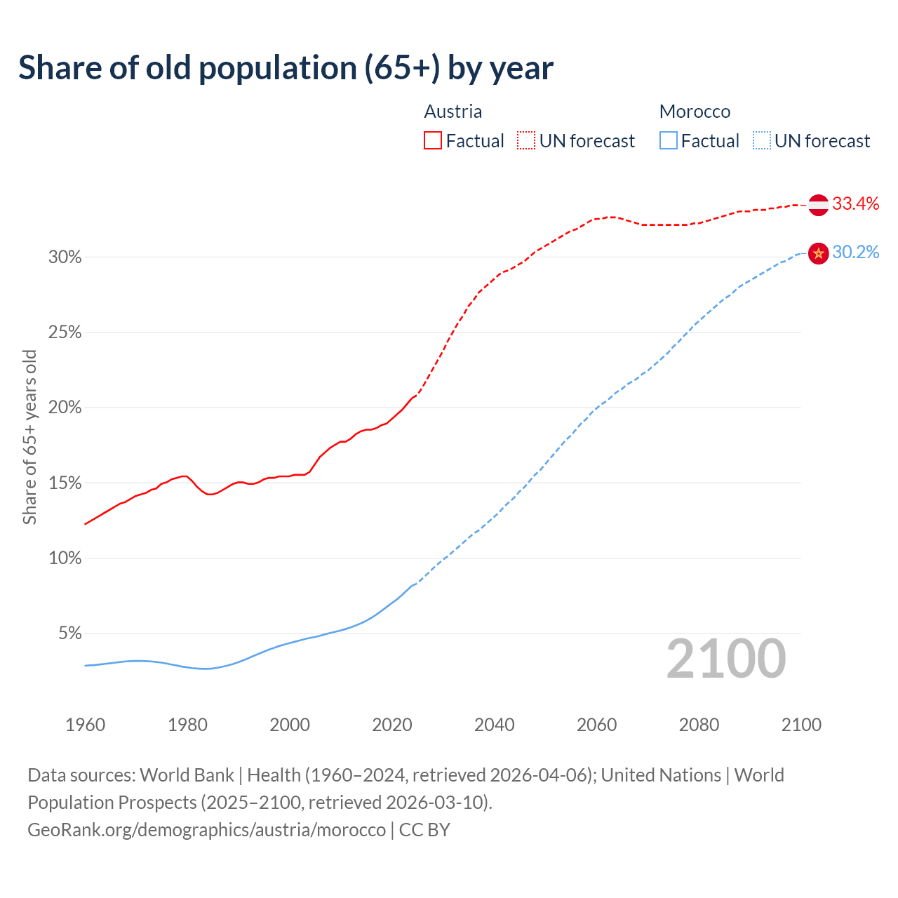 The share of older people aged 65 and over is 20.6% in Austria and 8.14% in Morocco. Life expectancy in Austria compared to Morocco .