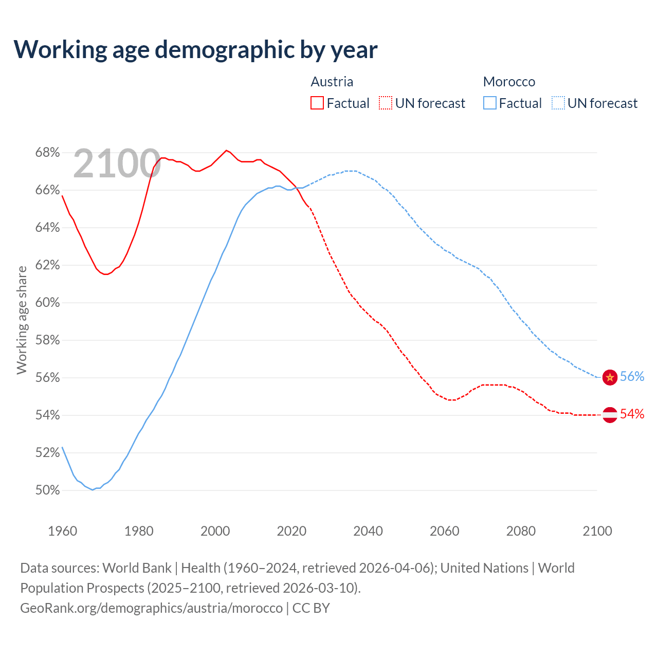 - Austria has 5.97M working age adults (aged 15-64) vs 25.7M in Morocco.