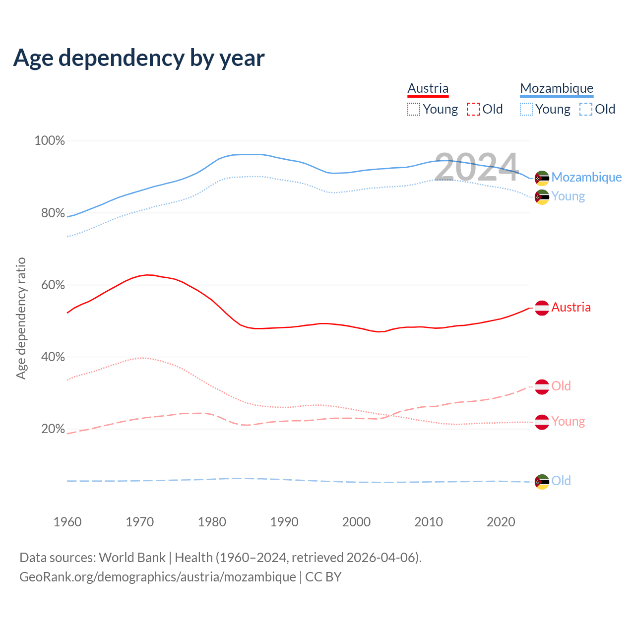 - The share of old-age demographic (65+) in Austria is 20.6% vs 2.75% in Mozambique.