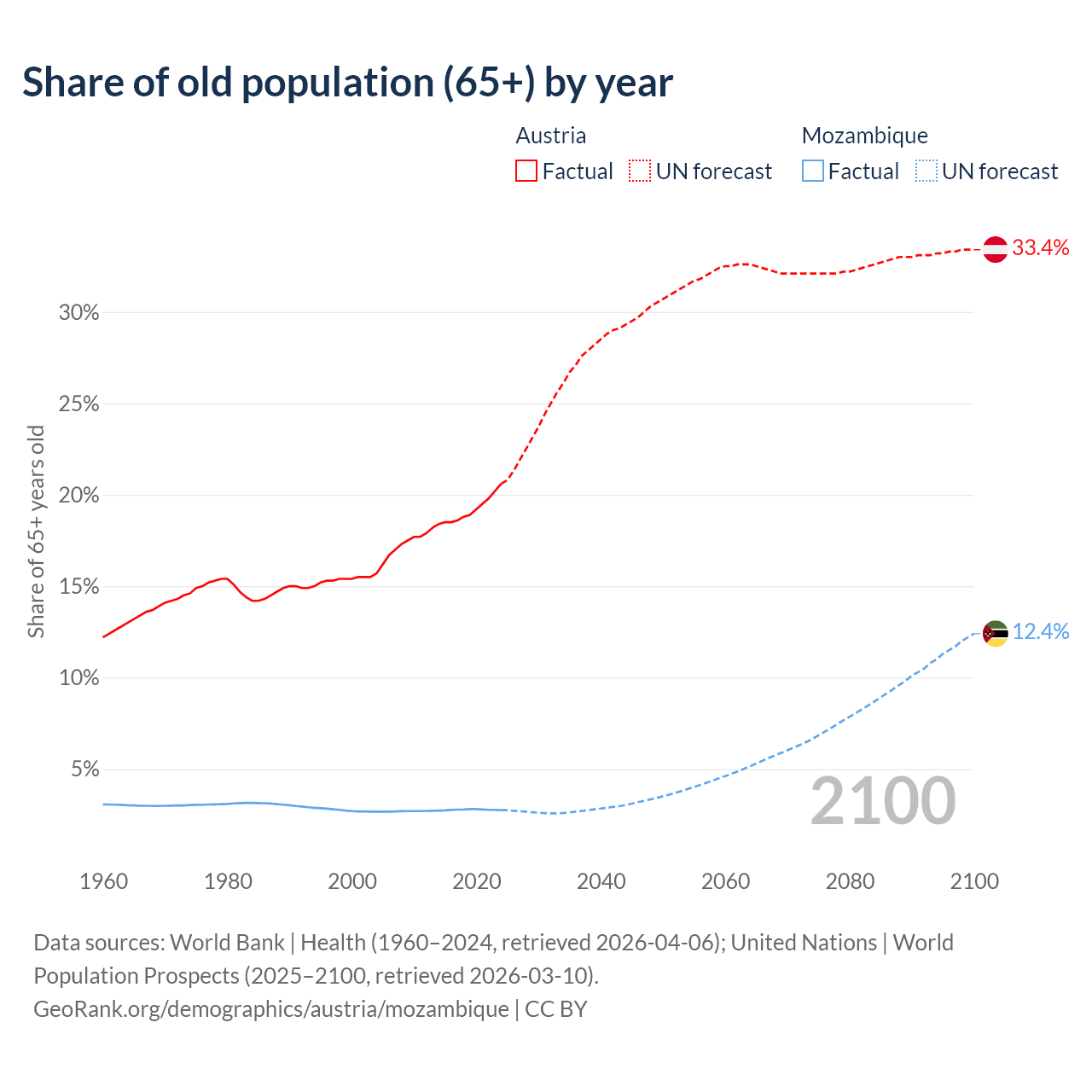 The share of older people aged 65 and over is 20.6% in Austria and 2.75% in Mozambique. Life expectancy in Austria compared to Mozambique .