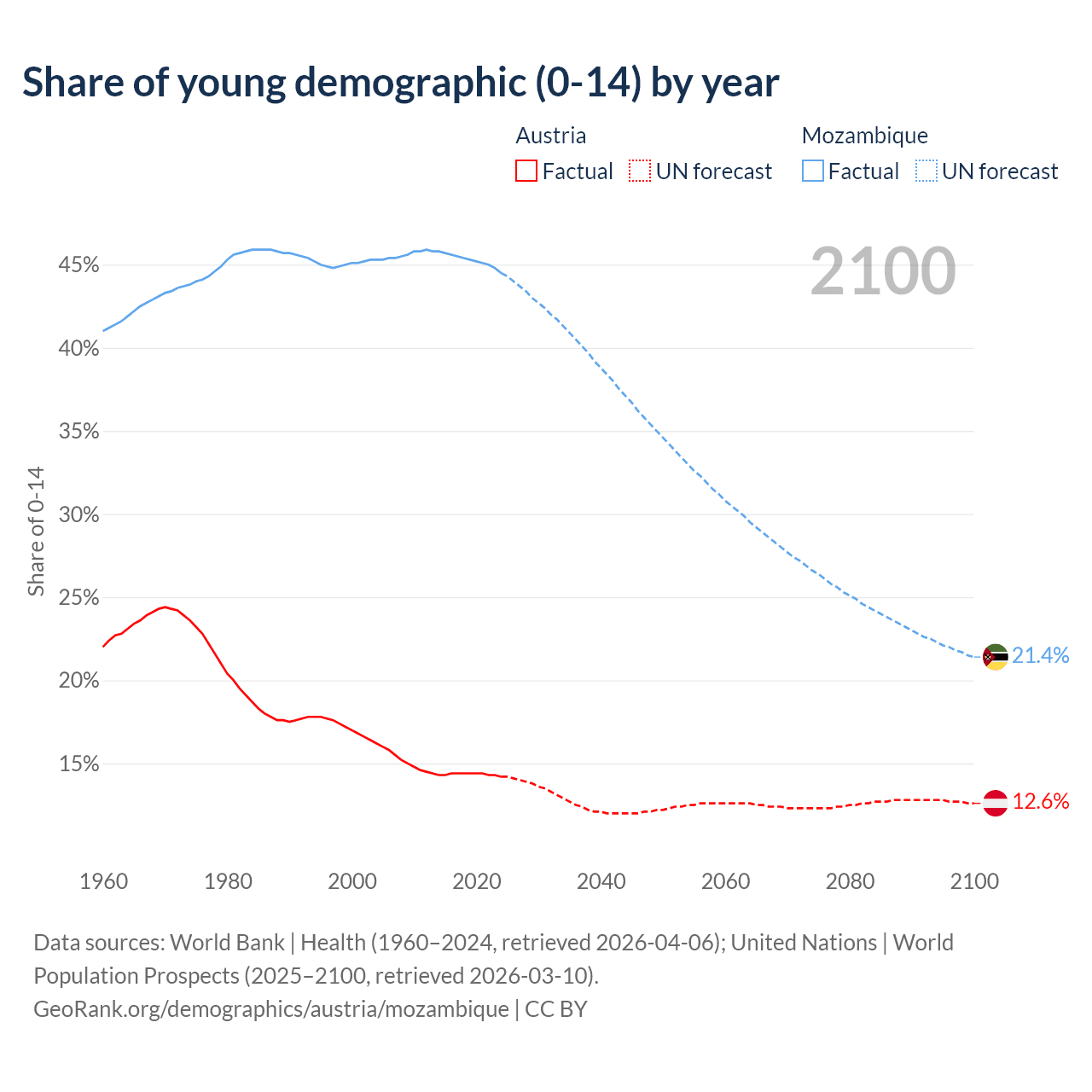 - The share of young demographic (0-15 years old) in Austria is 14.2% vs 44.5% in Mozambique.