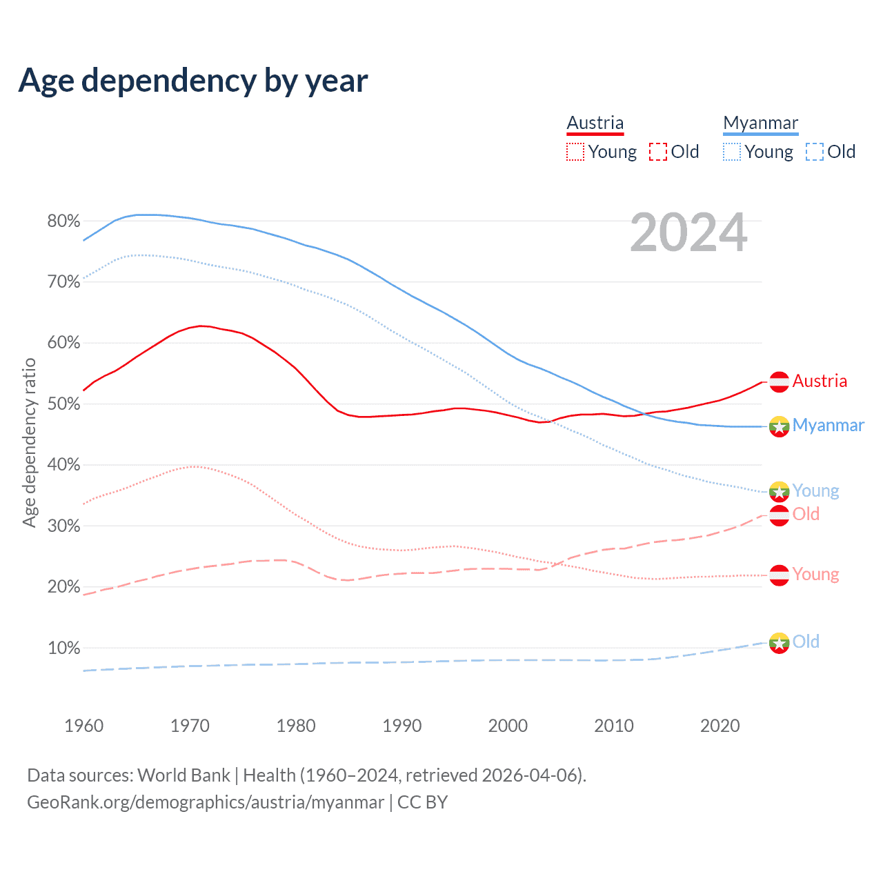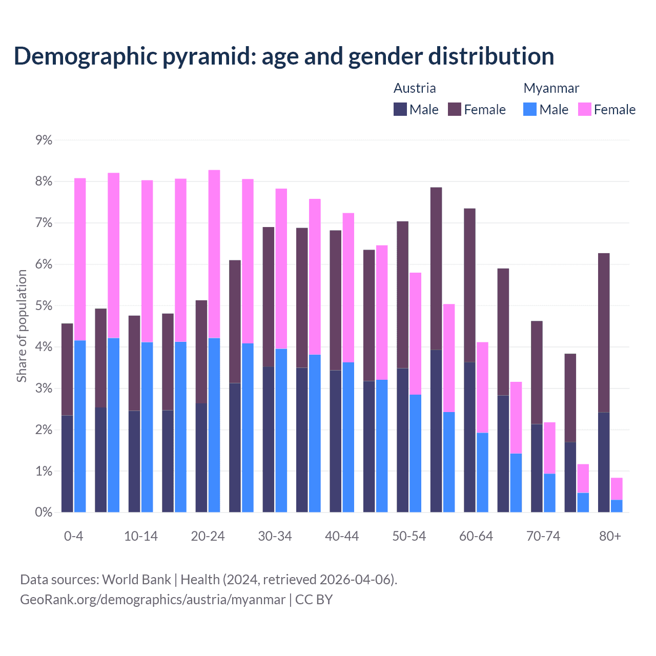 - The share of old-age demographic (65+) in Austria is 20.6% vs 7.3% in Myanmar.