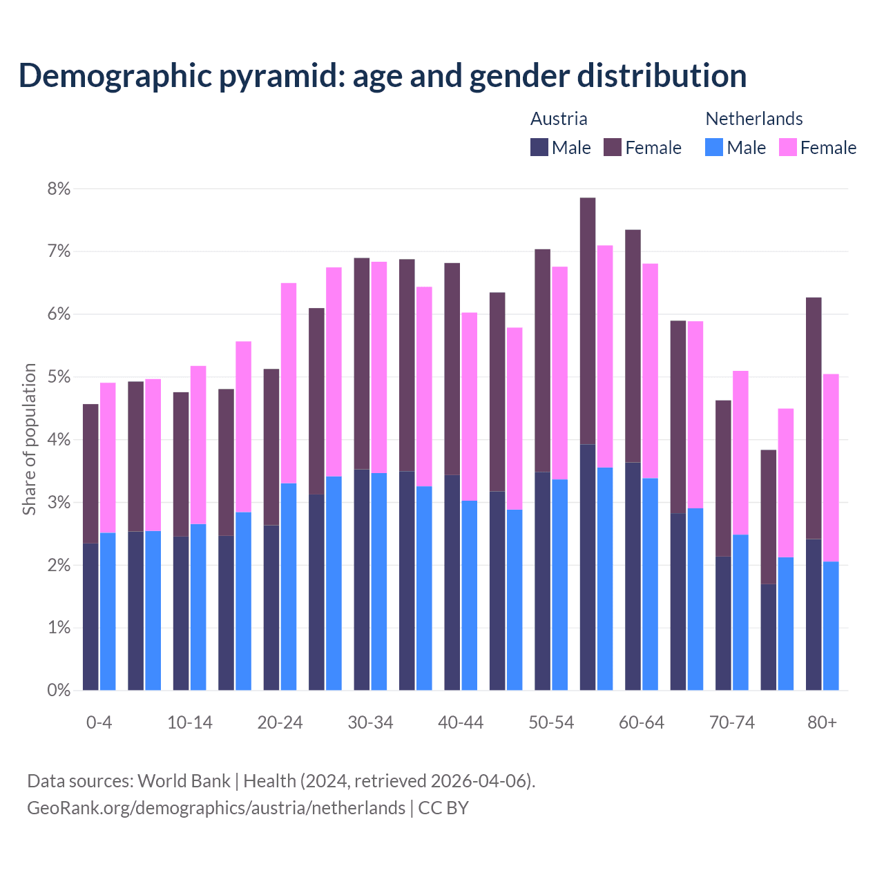 - Austria is ranked 19/196 by median age (oldest to youngest) vs 33/196 for the Netherlands.