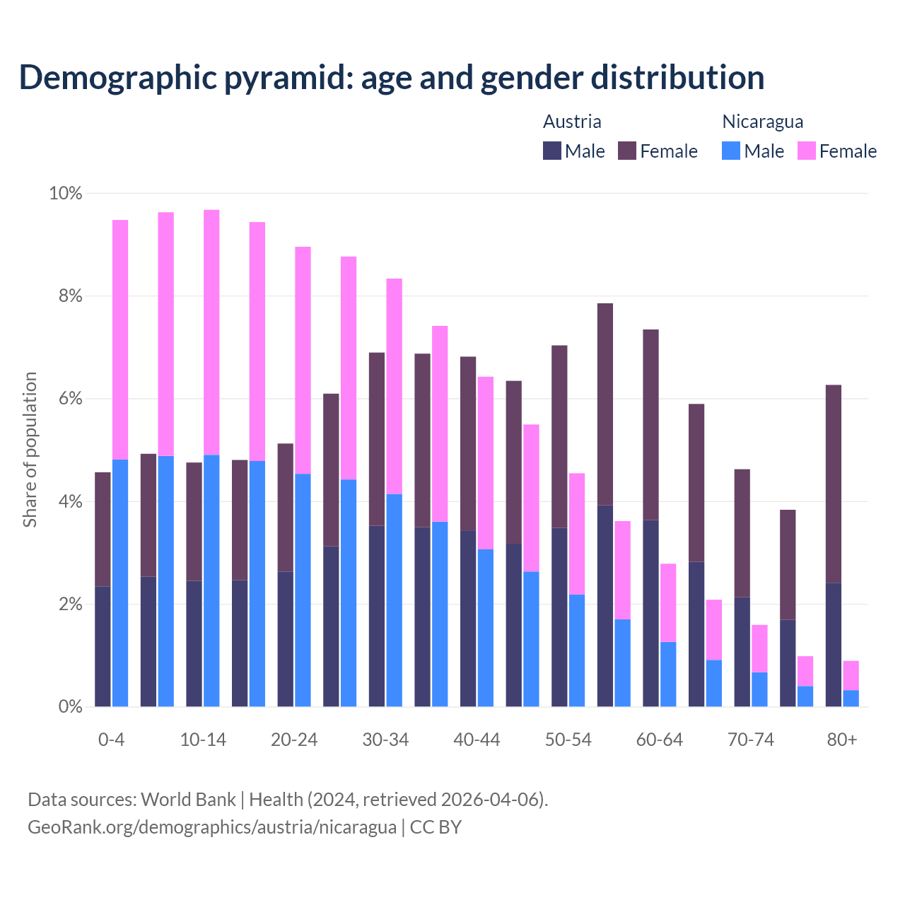 - The share of old-age demographic (65+) in Austria is 20.6% vs 5.53% in Nicaragua.