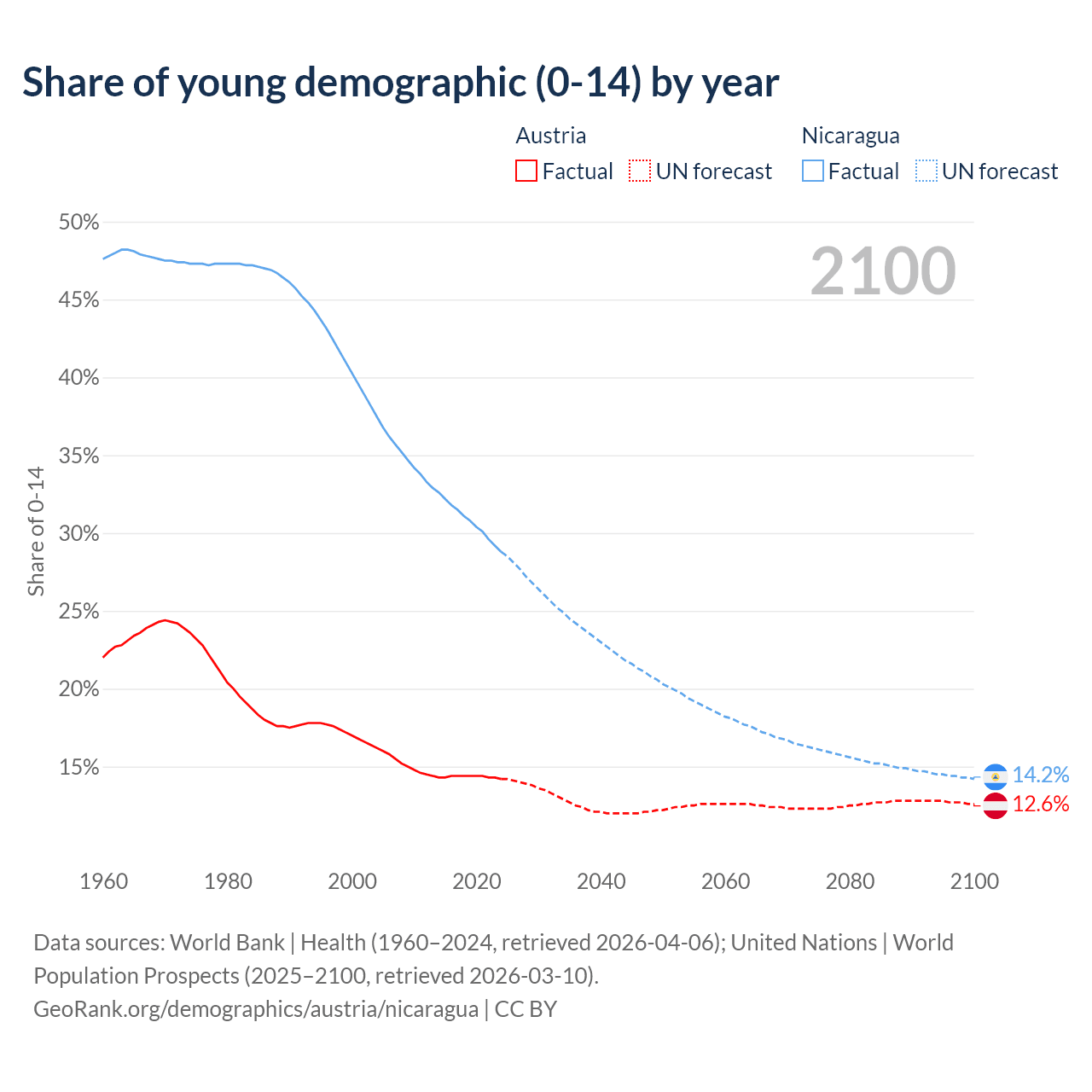 - The share of young demographic (0-15 years old) in Austria is 14.2% vs 28.8% in Nicaragua.