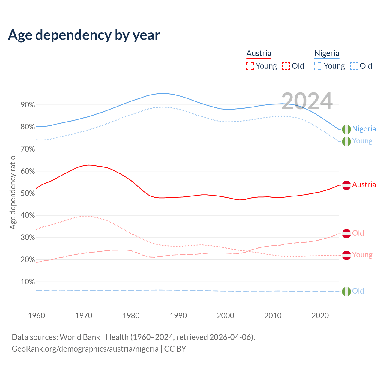 - Austria is ranked 19/196 by median age (oldest to youngest) vs 178/196 for Nigeria.