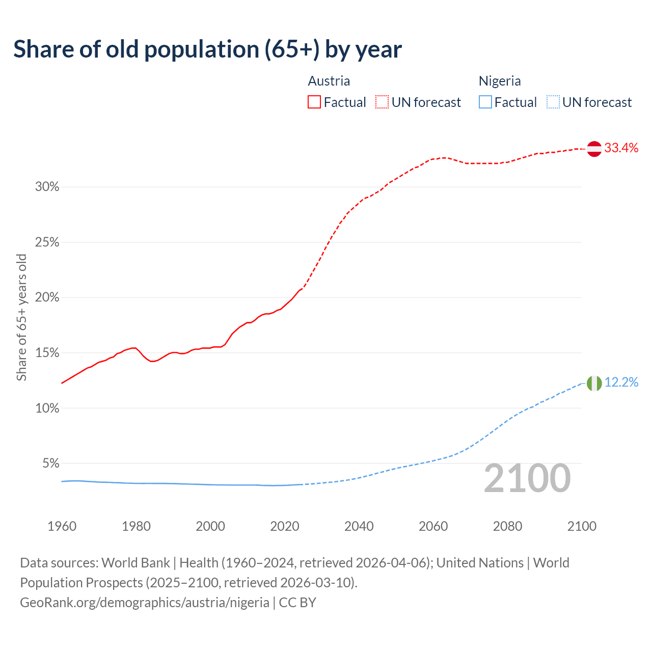 The share of older people aged 65 and over is 20.6% in Austria and 3.05% in Nigeria. Life expectancy in Austria compared to Nigeria .