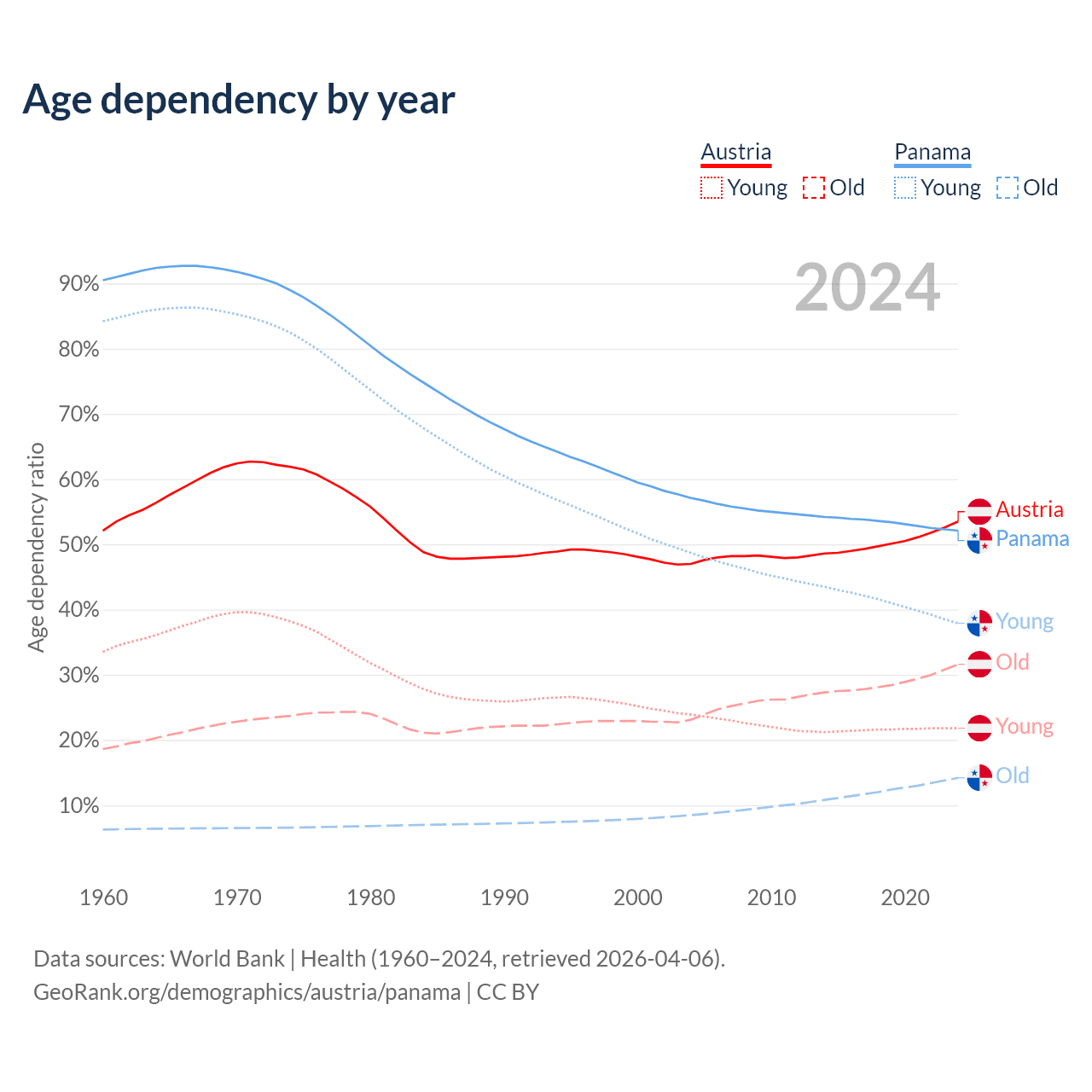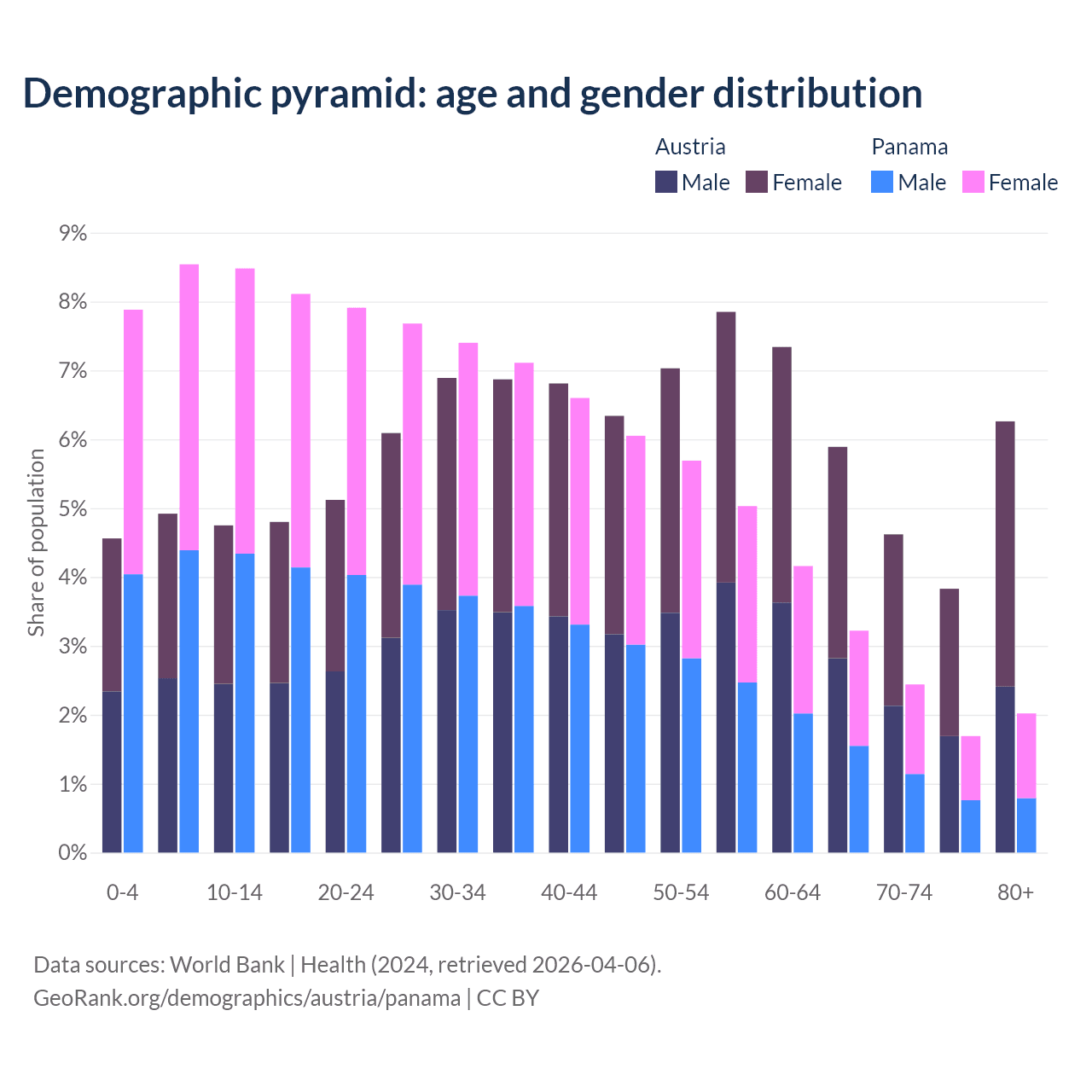 - Austria is ranked 19/196 by median age (oldest to youngest) vs 94/196 for Panama.