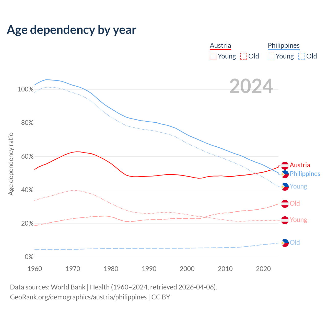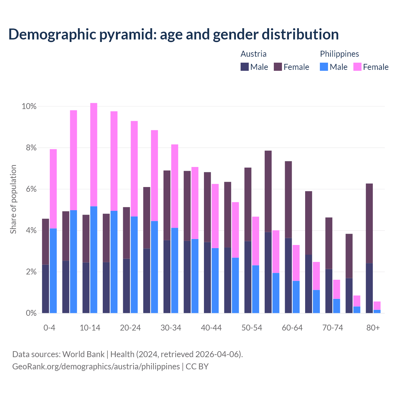 - Austria is ranked 19/196 by median age (oldest to youngest) vs 123/196 for the Philippines.