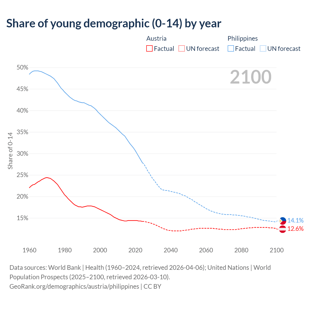 - The share of young demographic (0-15 years old) in Austria is 14.2% vs 27.9% in the Philippines.