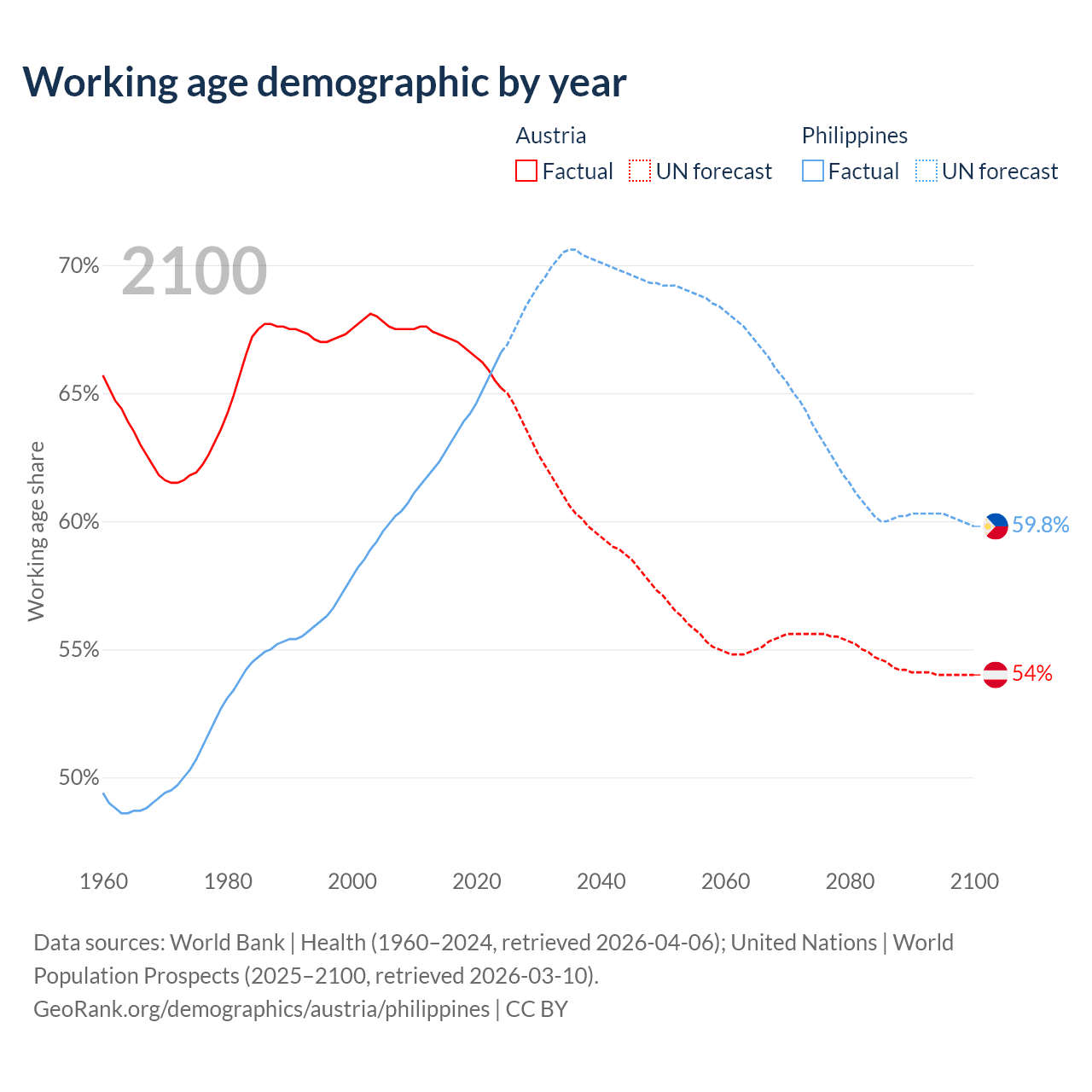 - Austria has 5.97M working age adults (aged 15-64) vs 78.6M in the Philippines.