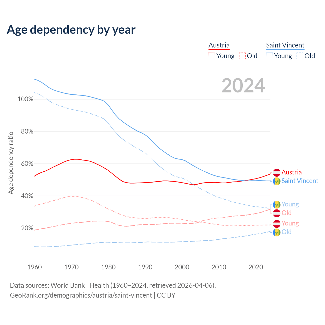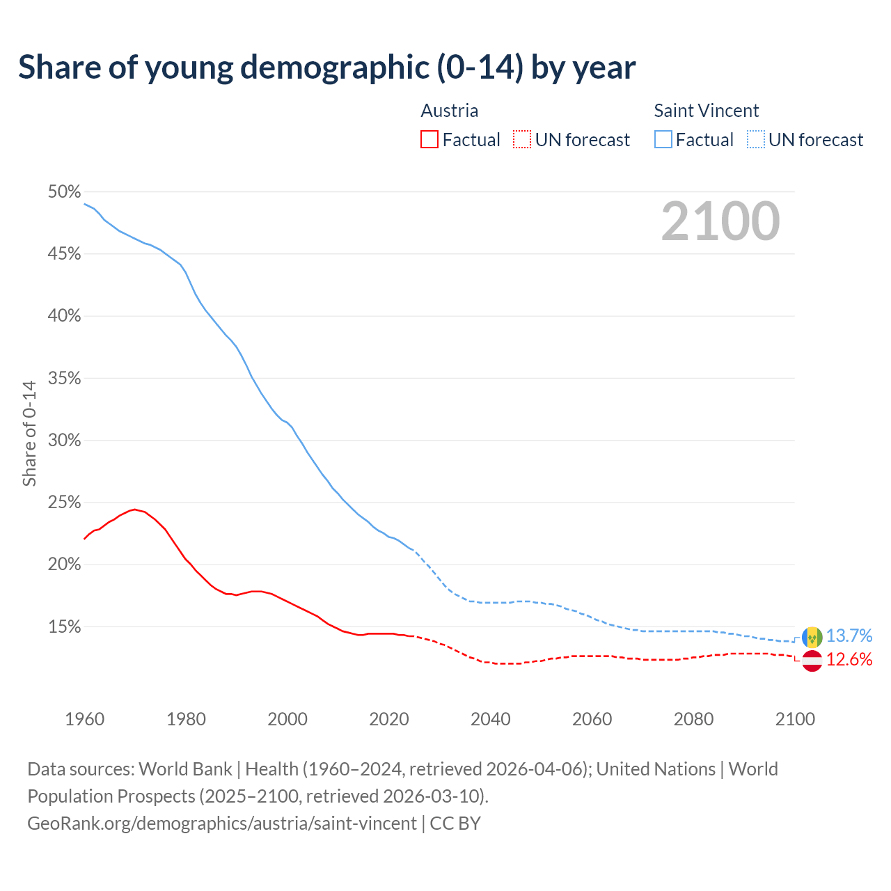 - The share of young demographic (0-15 years old) in Austria is 14.2% vs 21.3% in Saint Vincent.
