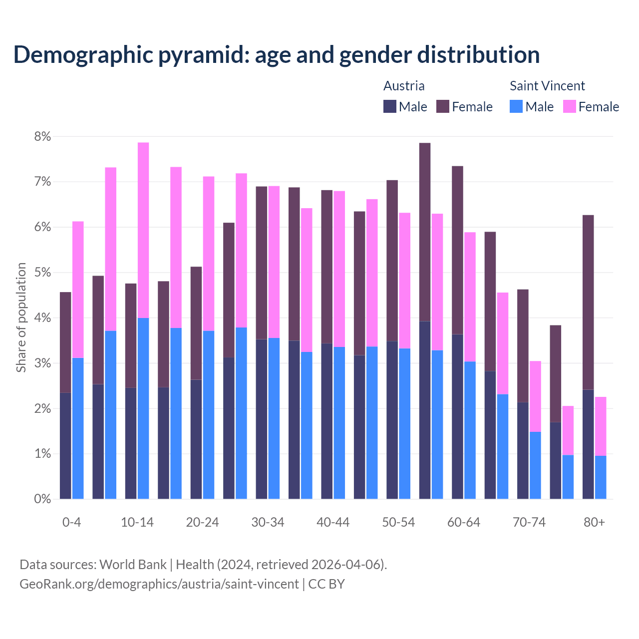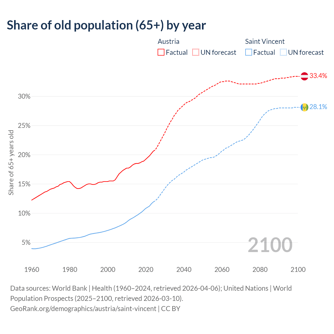 - The share of old-age demographic (65+) in Austria is 20.6% vs 11.9% in Saint Vincent.