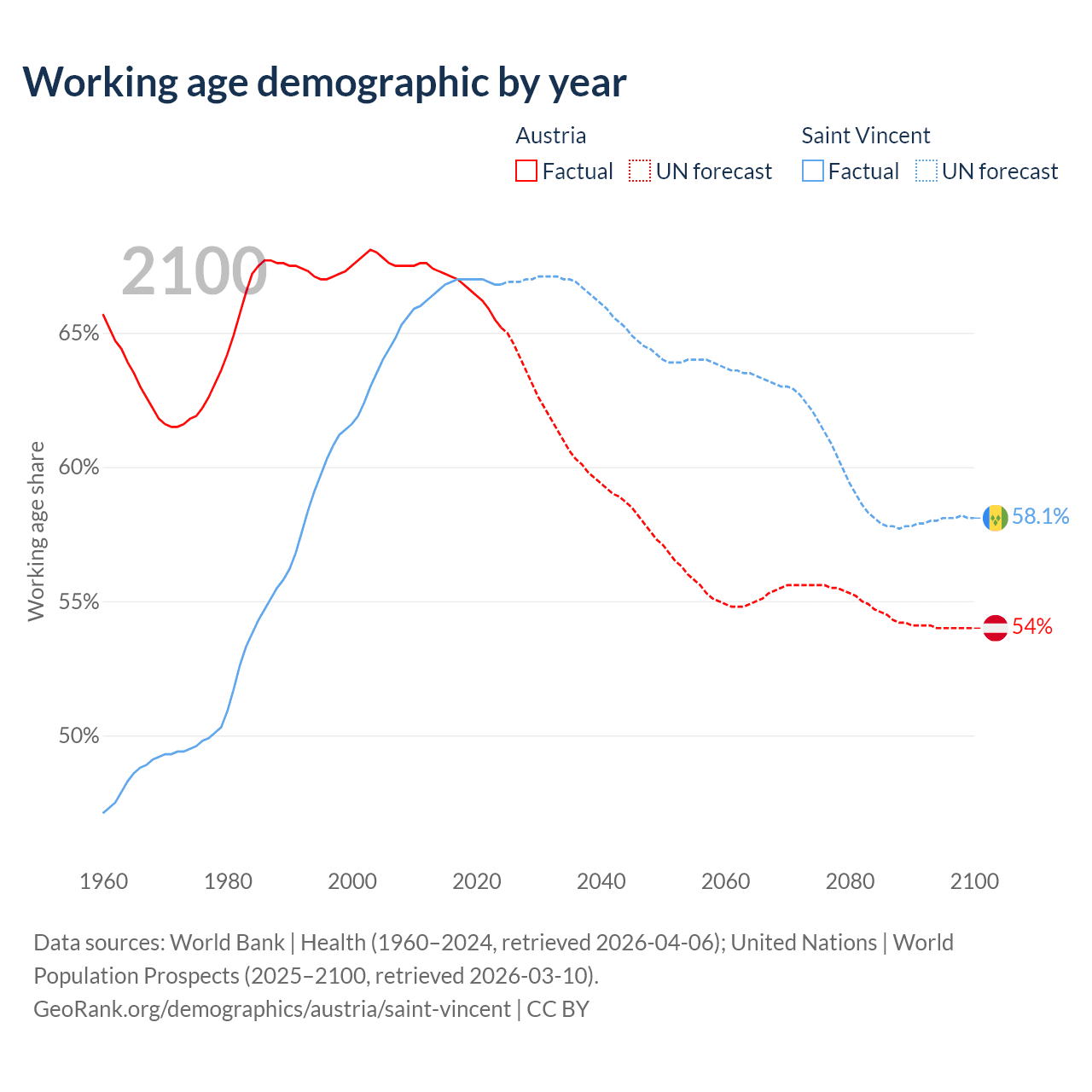 - Austria has 5.97M working age adults (aged 15-64) vs 66.3K in Saint Vincent.