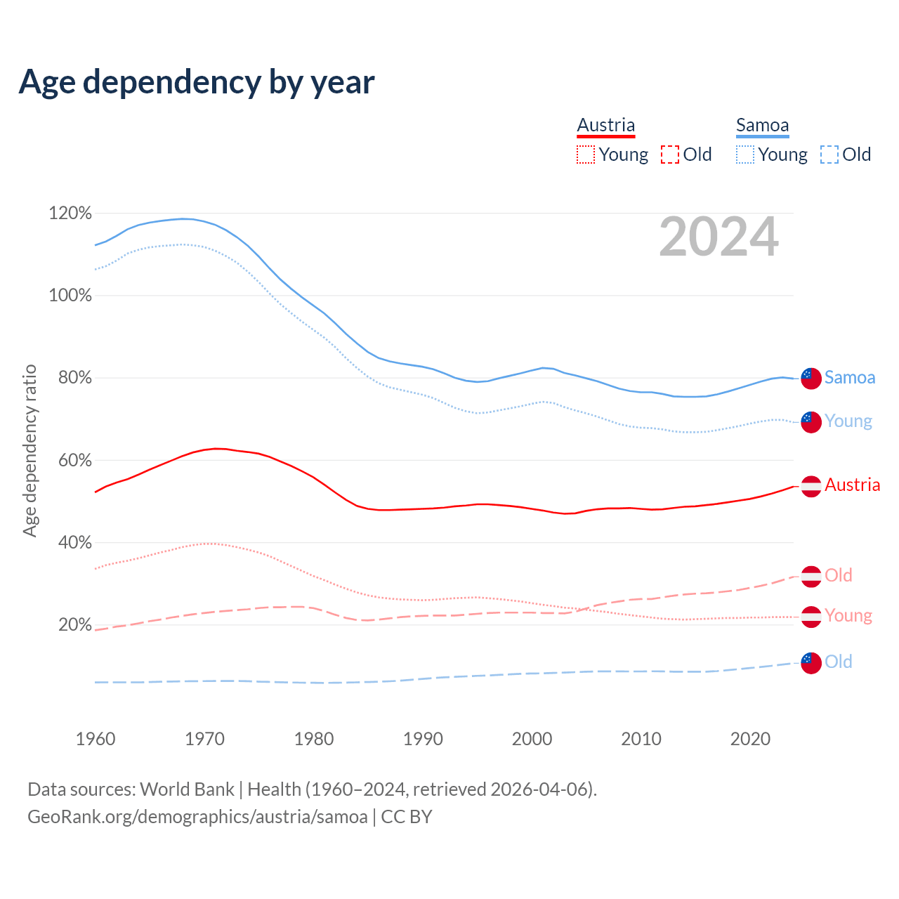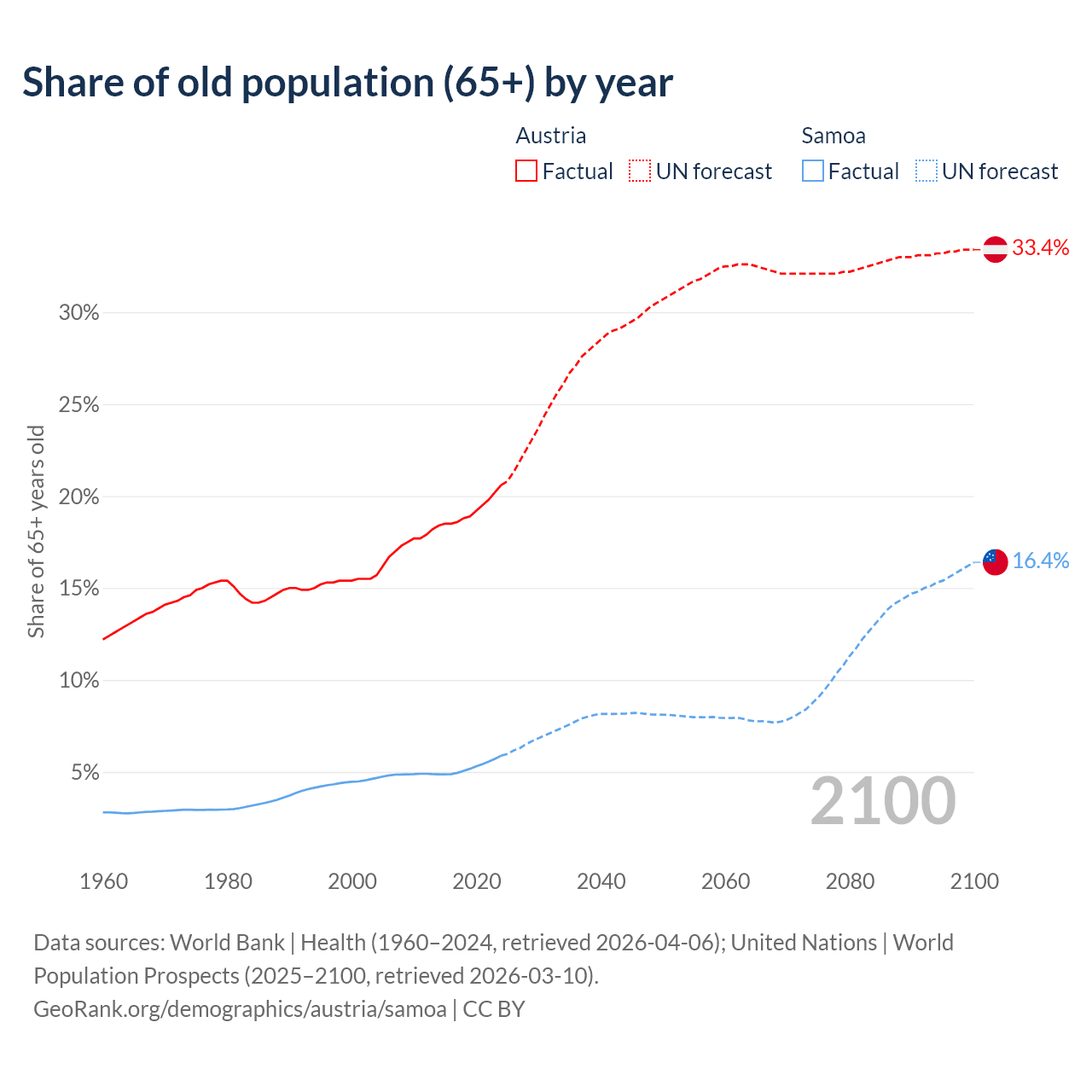 - The share of old-age demographic (65+) in Austria is 20.6% vs 5.88% in Samoa.