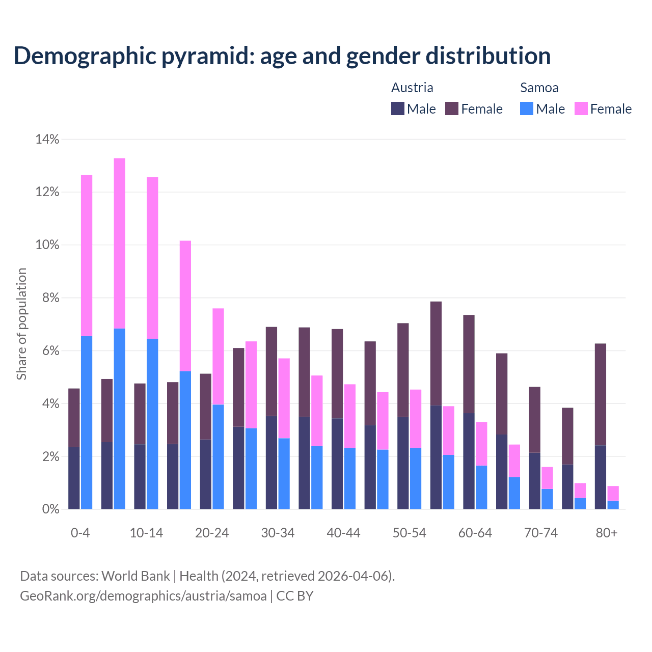 - The share of young demographic (0-15 years old) in Austria is 14.2% vs 38.5% in Samoa.