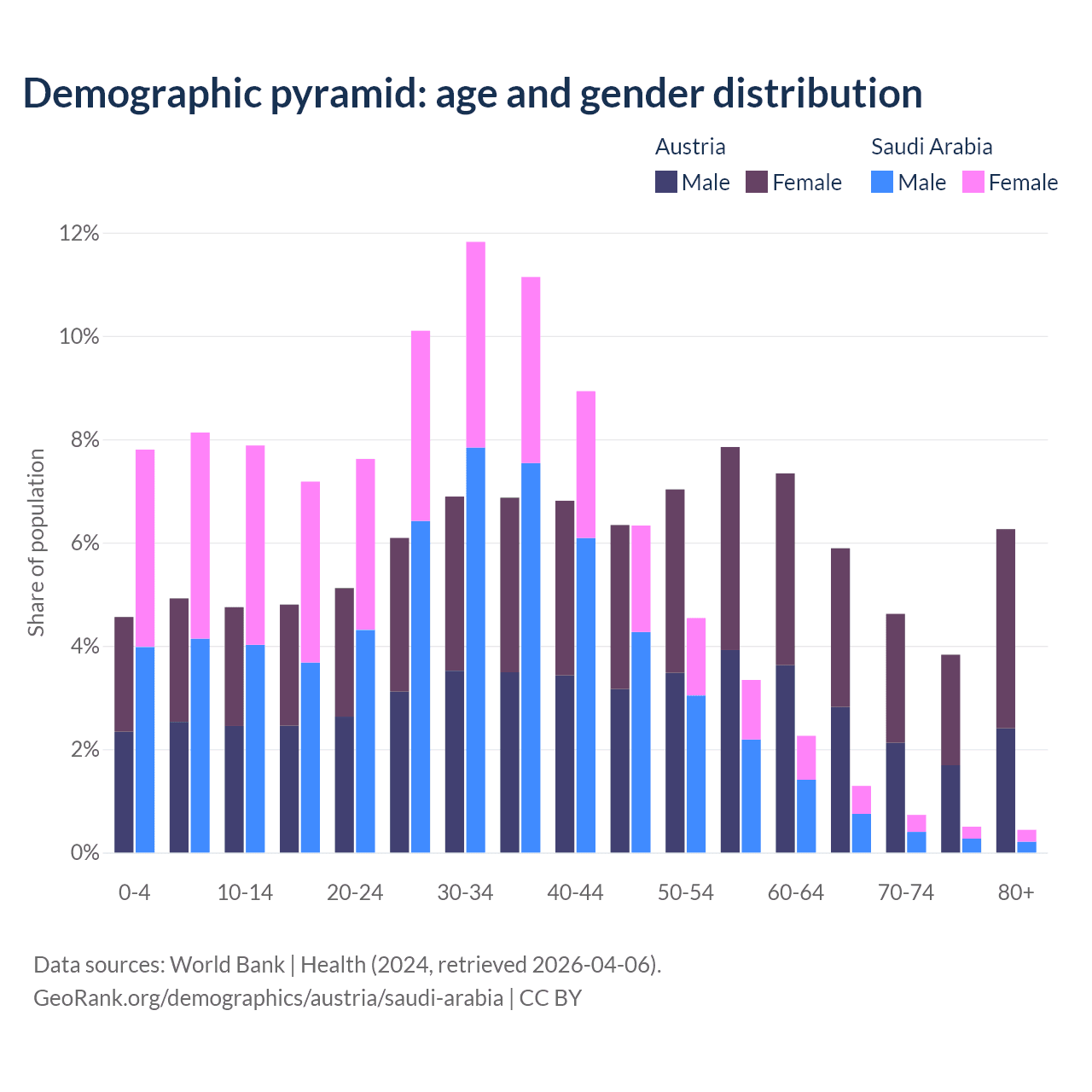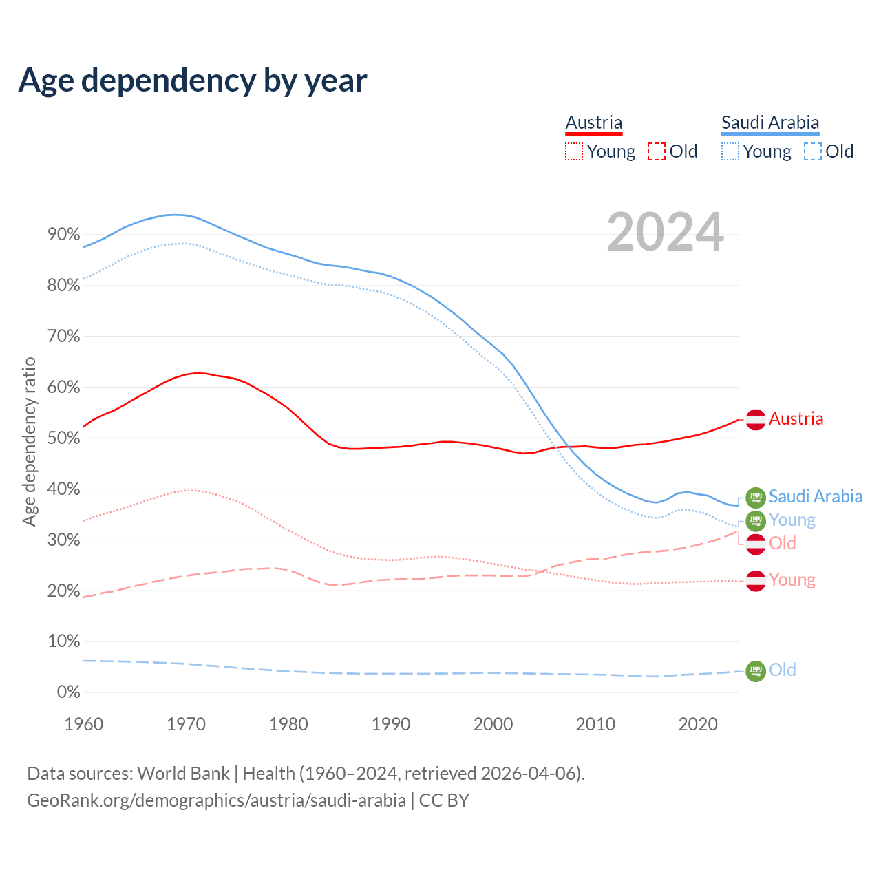 - Austria is ranked 19/196 by median age (oldest to youngest) vs 98/196 for Saudi Arabia.