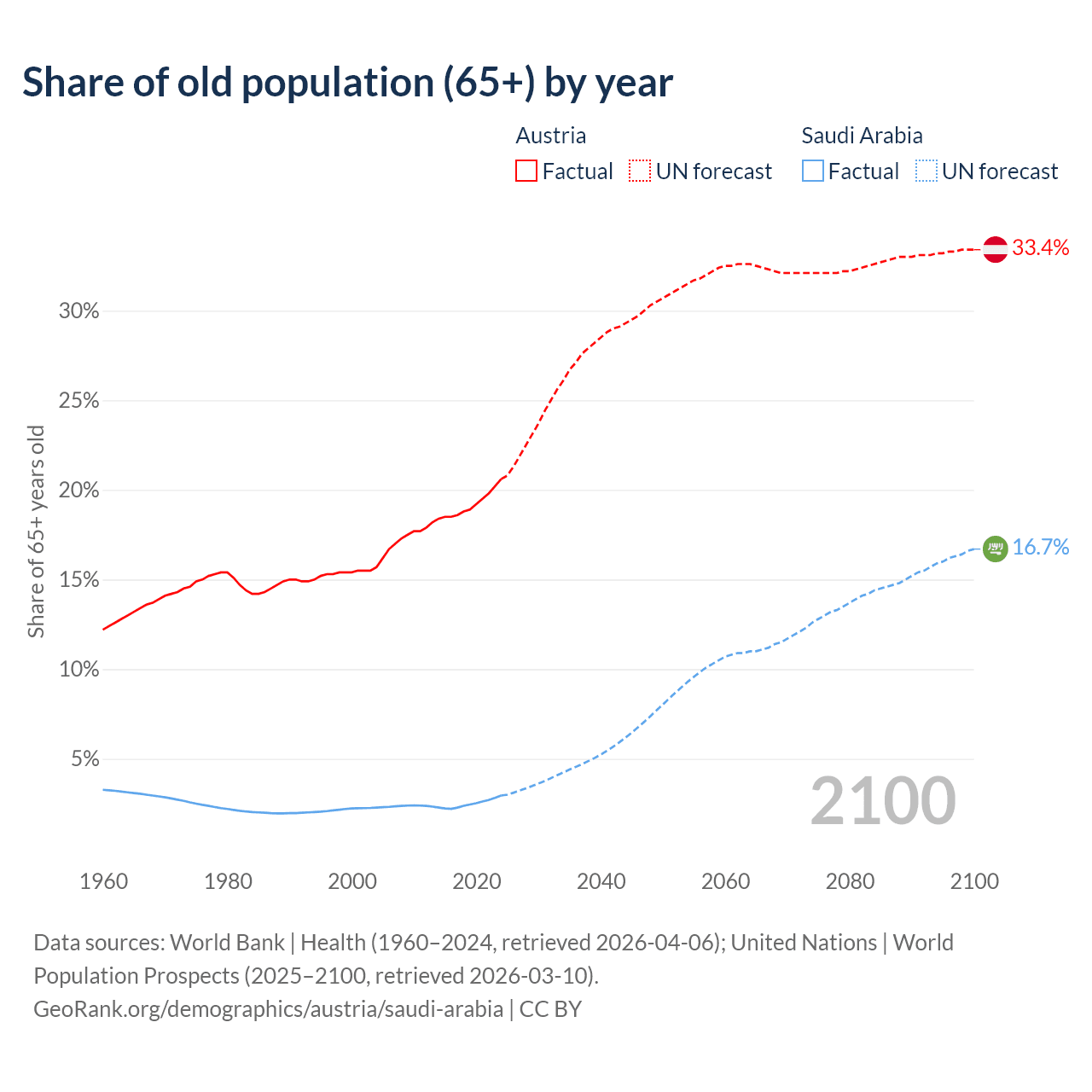 The share of older people aged 65 and over is 20.6% in Austria and 2.95% in Saudi Arabia. Life expectancy in Austria compared to Saudi Arabia .