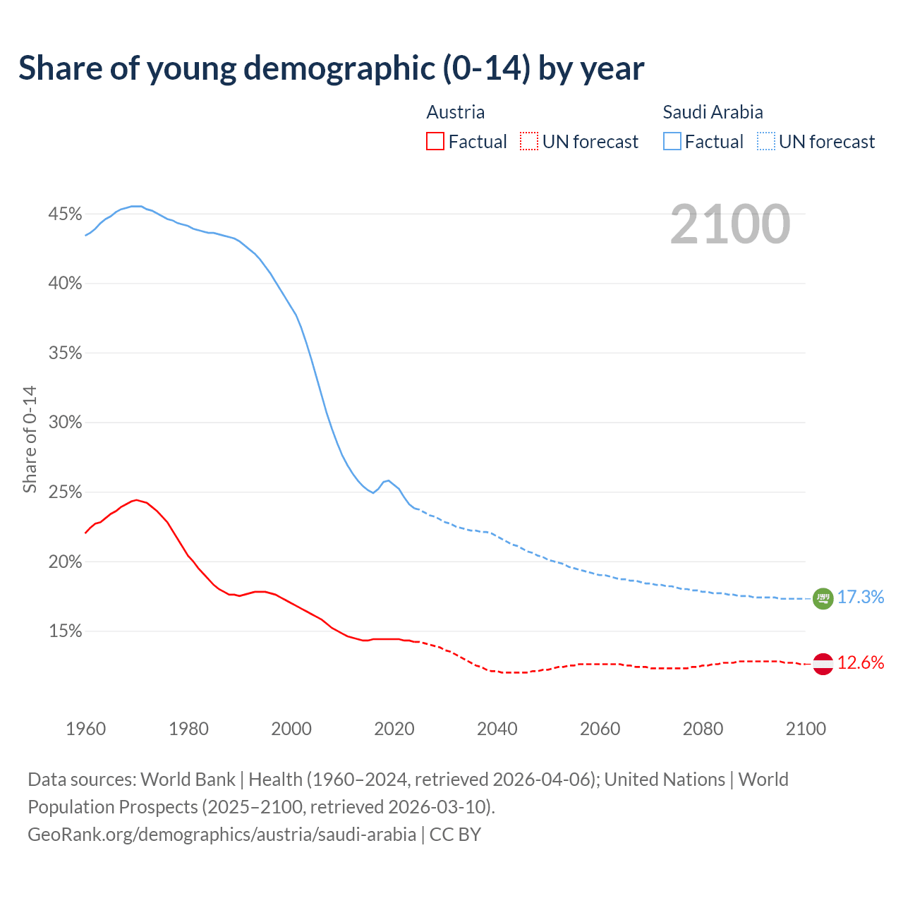 - The share of young demographic (0-15 years old) in Austria is 14.2% vs 23.8% in Saudi Arabia.