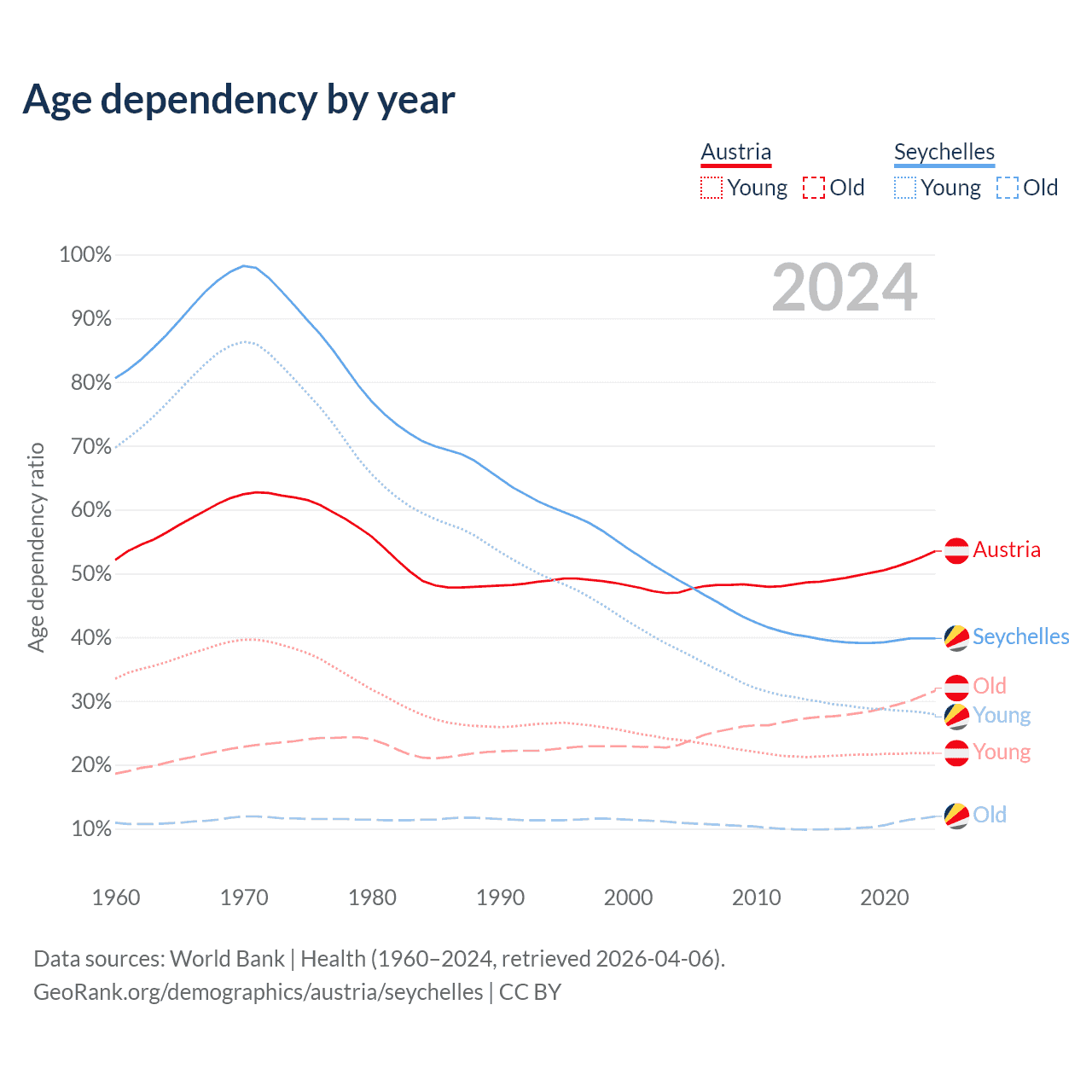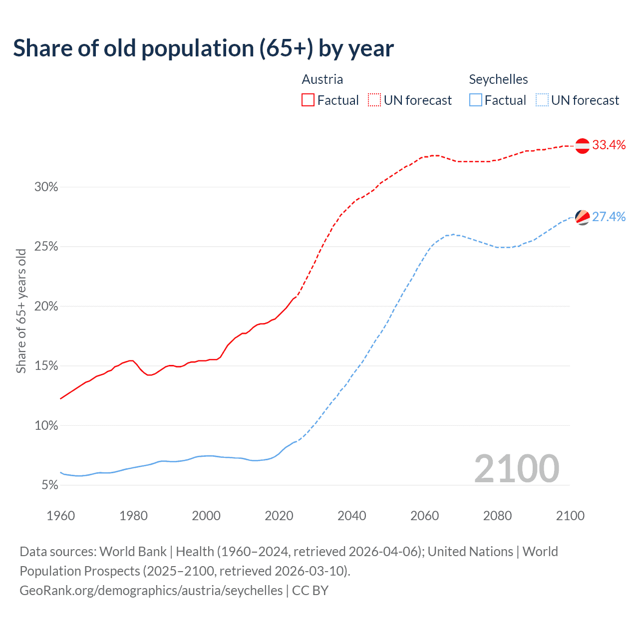 - The share of old-age demographic (65+) in Austria is 20.6% vs 8.54% in the Seychelles.