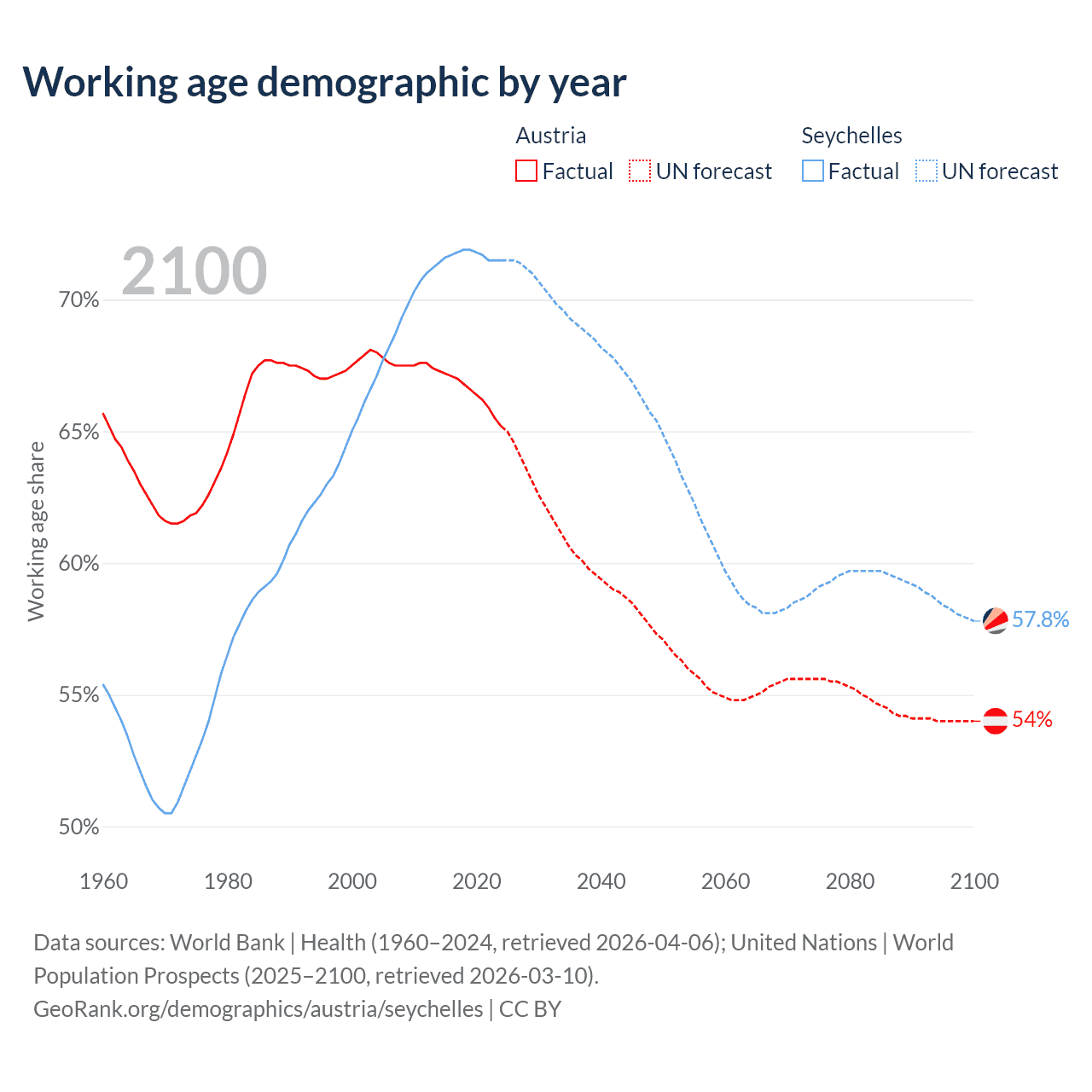 - Austria has 5.97M working age adults (aged 15-64) vs 90.3K in the Seychelles.