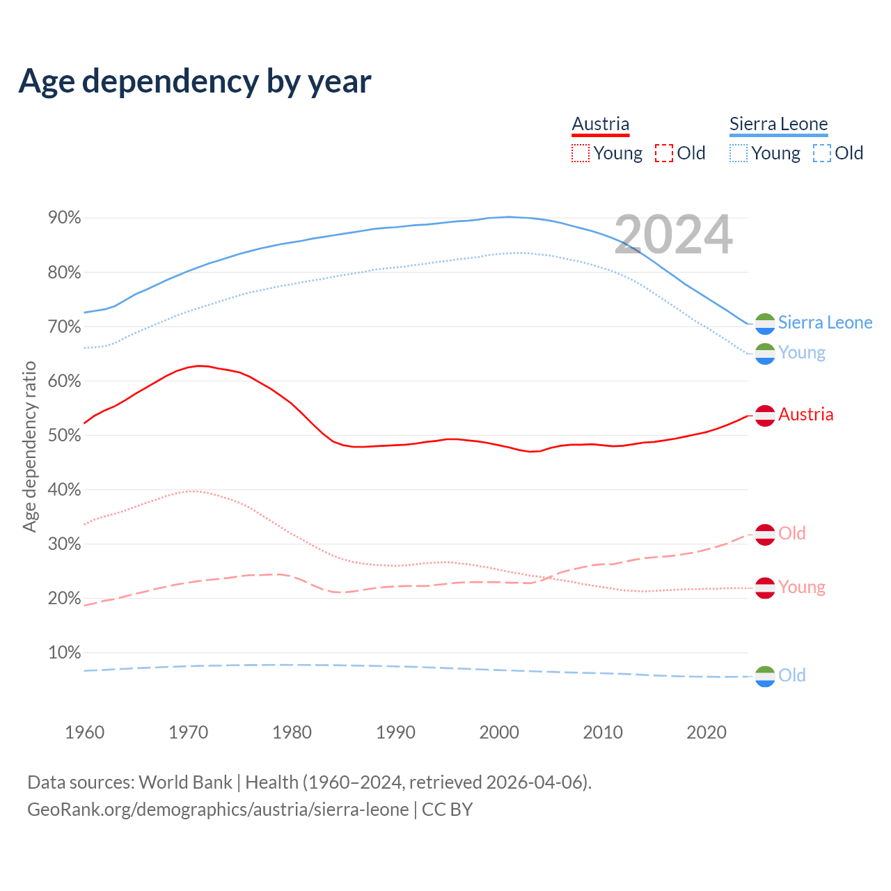- The share of old-age demographic (65+) in Austria is 20.6% vs 3.24% in Sierra Leone.