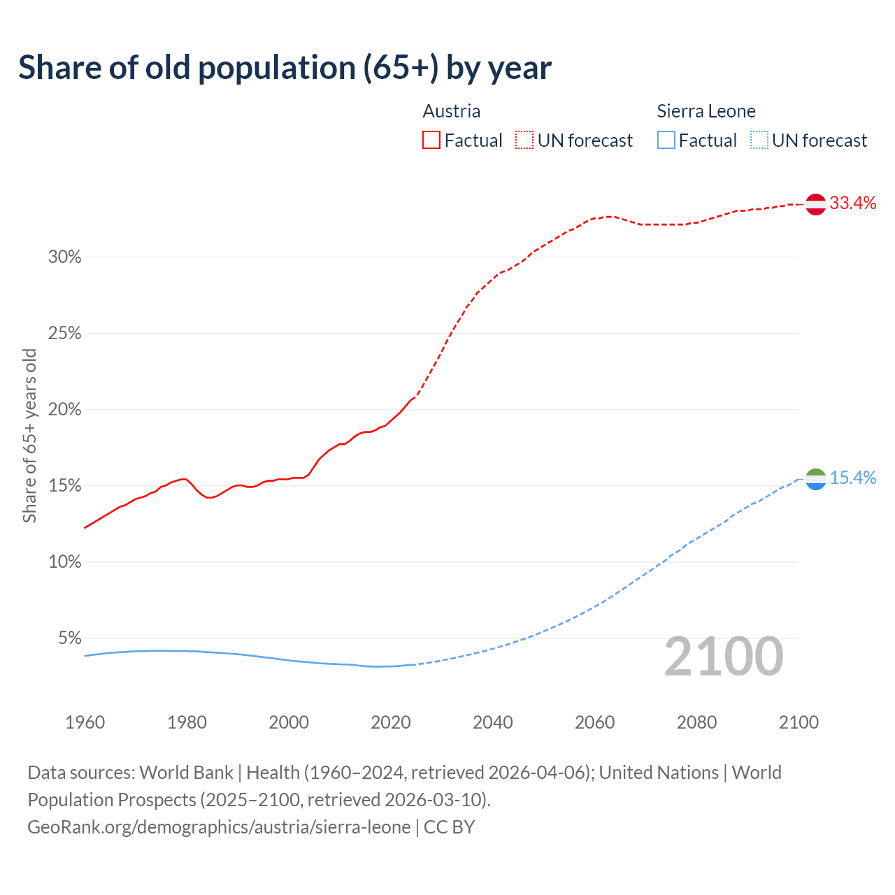 The share of older people aged 65 and over is 20.6% in Austria and 3.24% in Sierra Leone. Life expectancy in Austria compared to Sierra Leone .