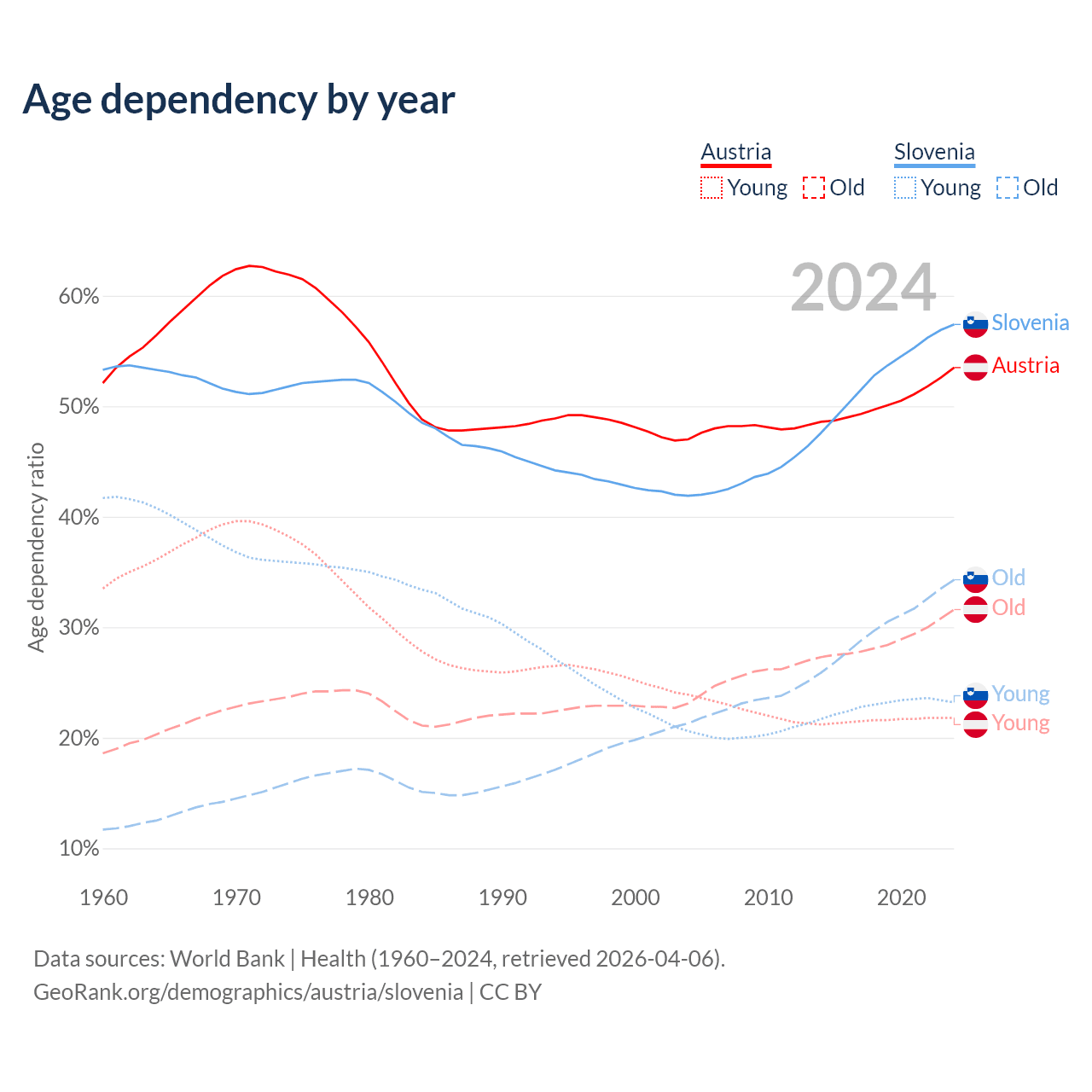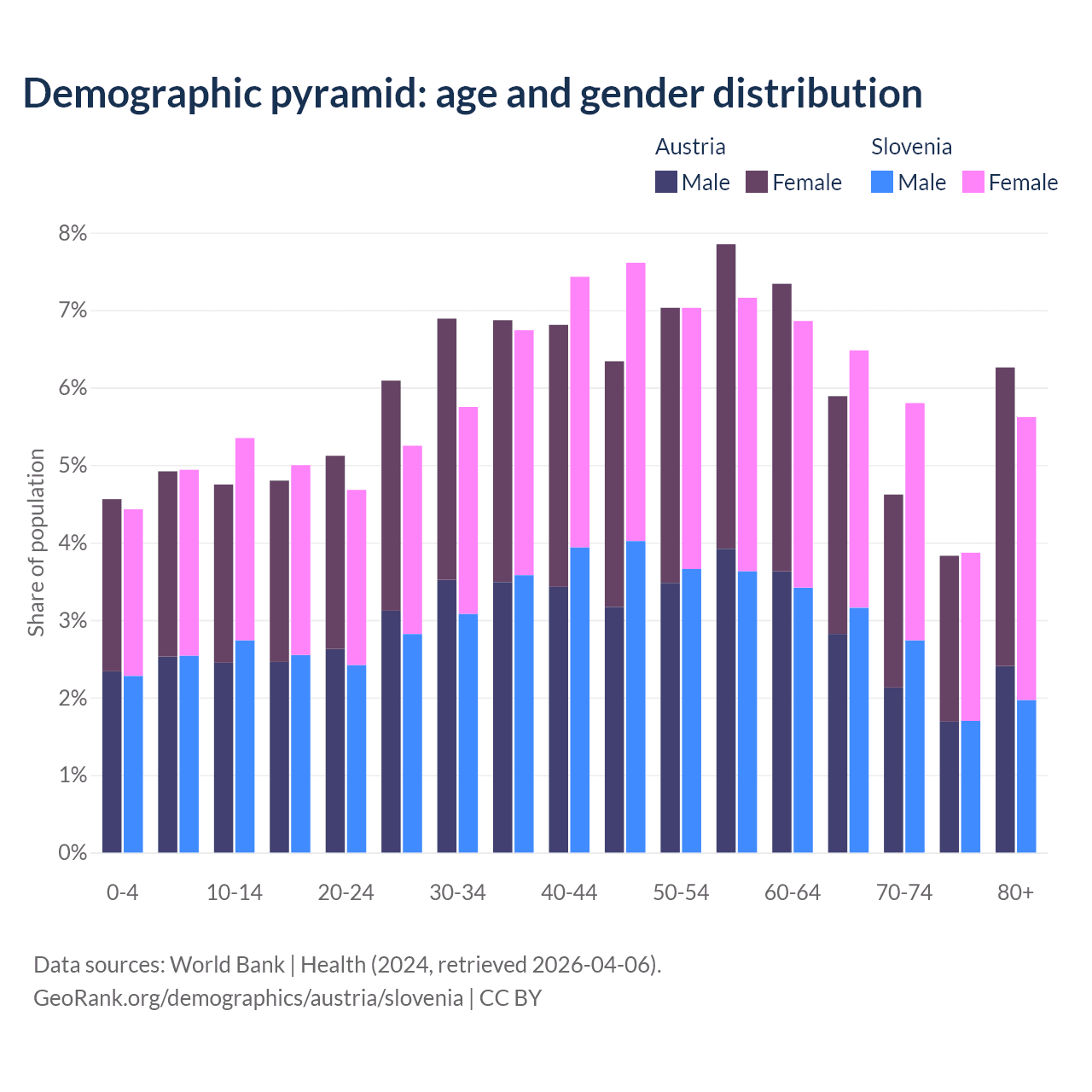 - Austria is ranked 19/196 by median age (oldest to youngest) vs 14/196 for Slovenia.