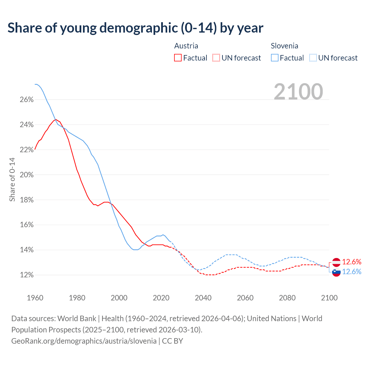 - The share of young demographic (0-15 years old) in Austria is 14.2% vs 14.7% in Slovenia.