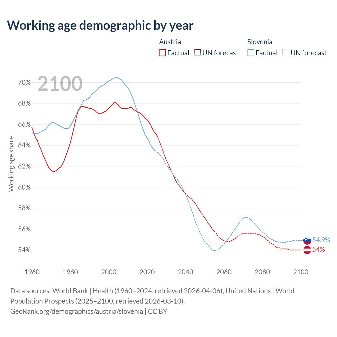Median age Austria vs Slovenia, 1960-2100