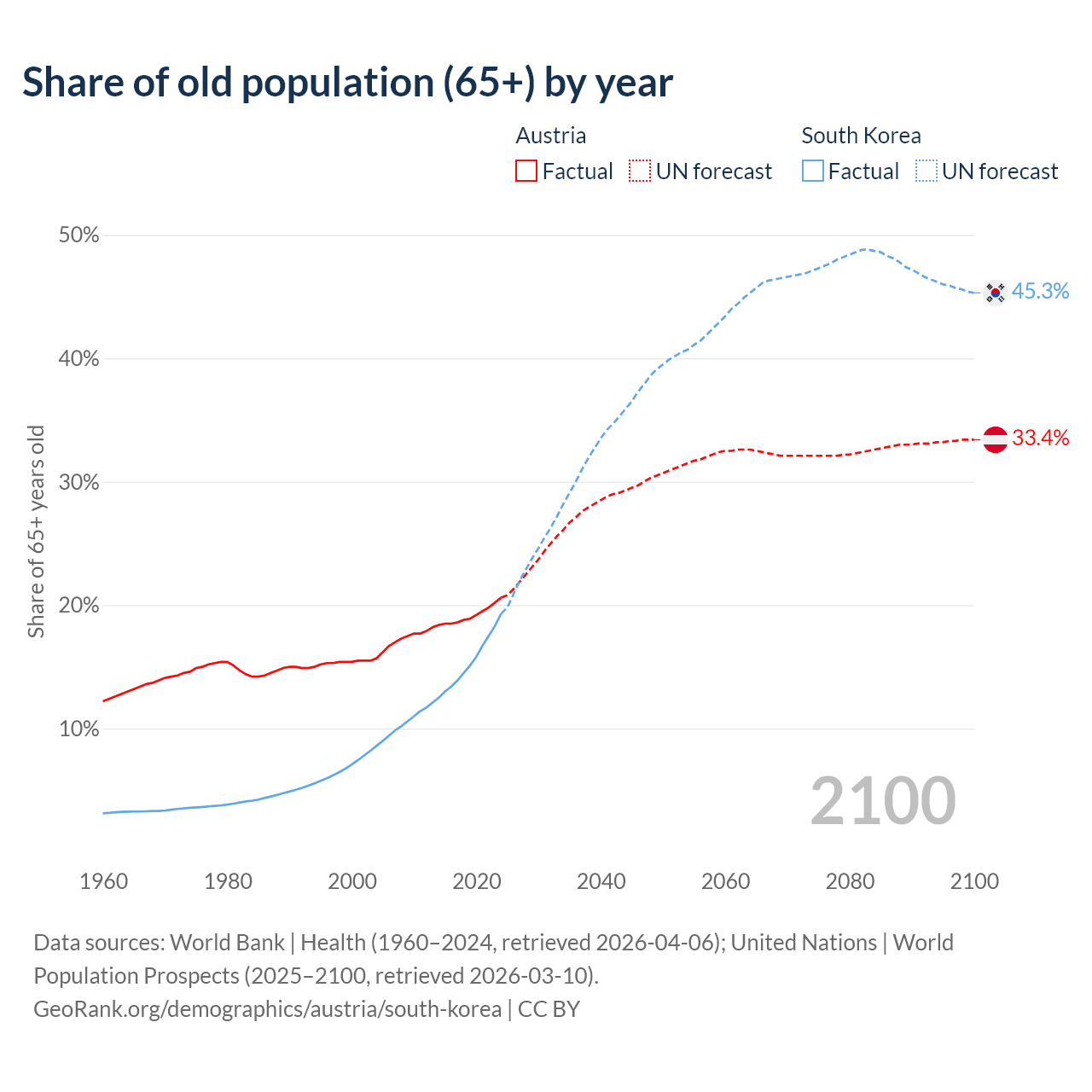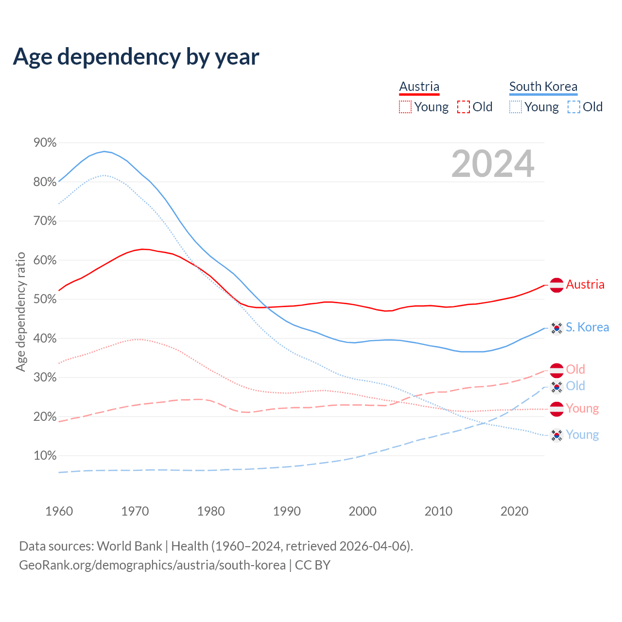 - Austria is ranked 19/196 by median age (oldest to youngest) vs 10/196 for South Korea.