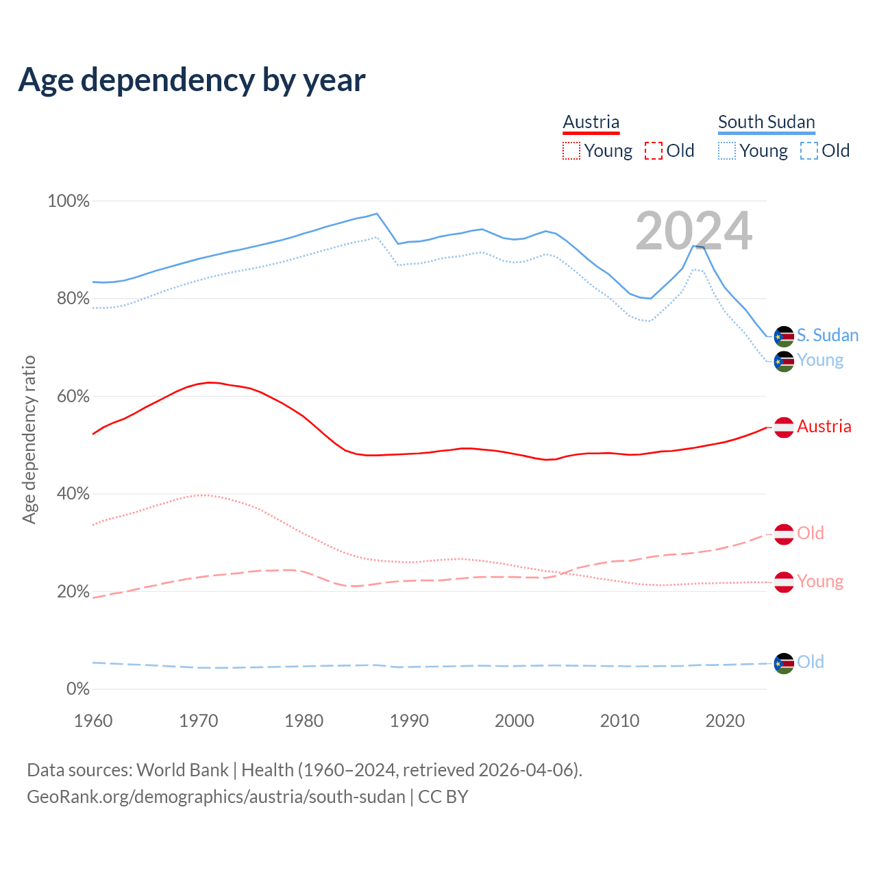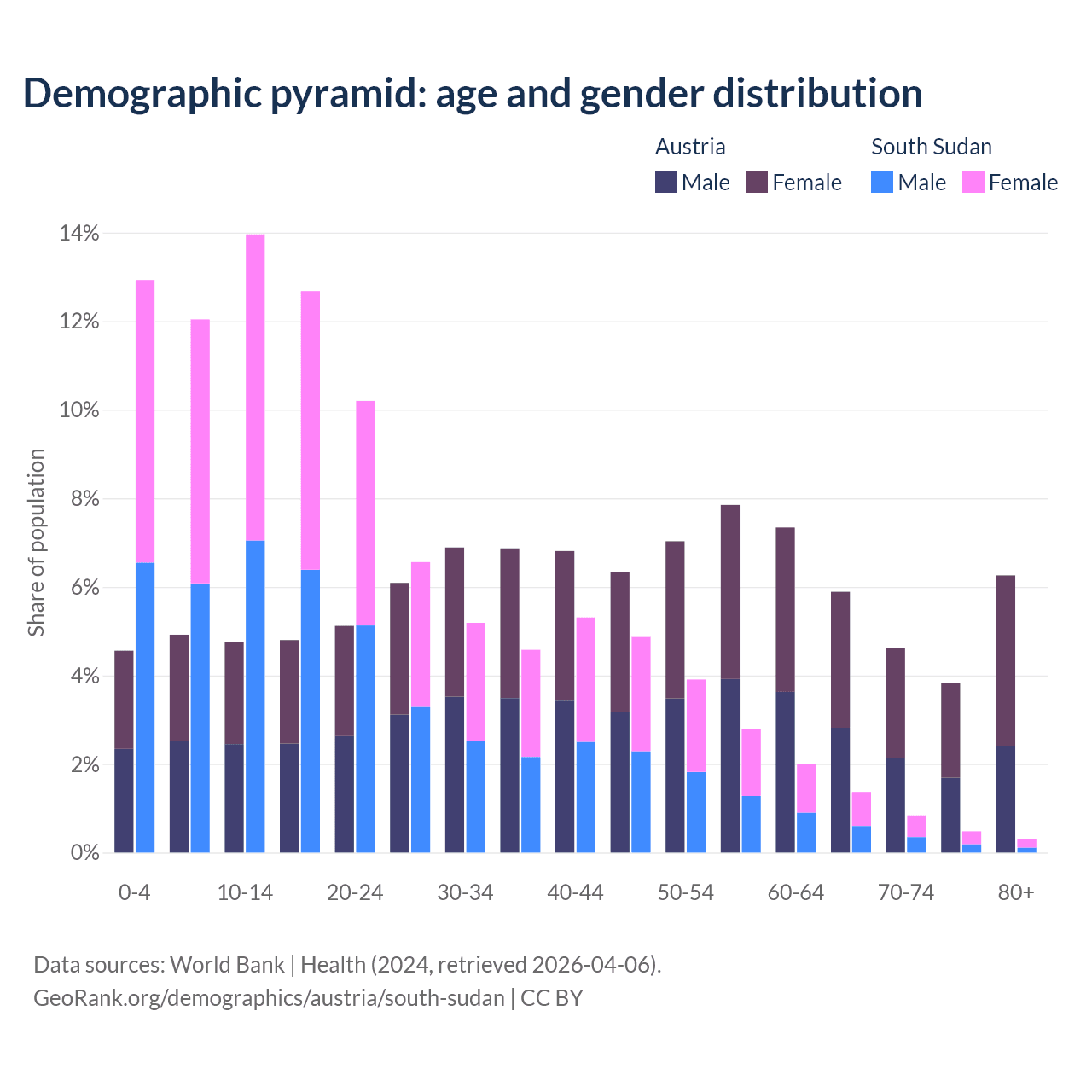 - Austria is ranked 19/196 by median age (oldest to youngest) vs 173/196 for South Sudan.