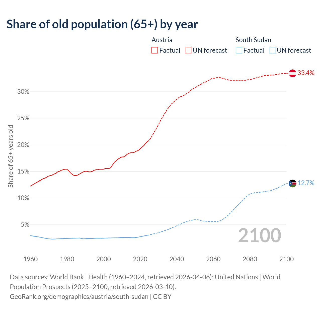 The share of older people aged 65 and over is 20.6% in Austria and 2.99% in South Sudan. Life expectancy in Austria compared to South Sudan .