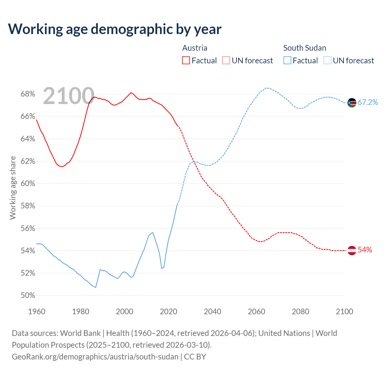 - Austria has 5.97M working age adults (aged 15-64) vs 7.27M in South Sudan.