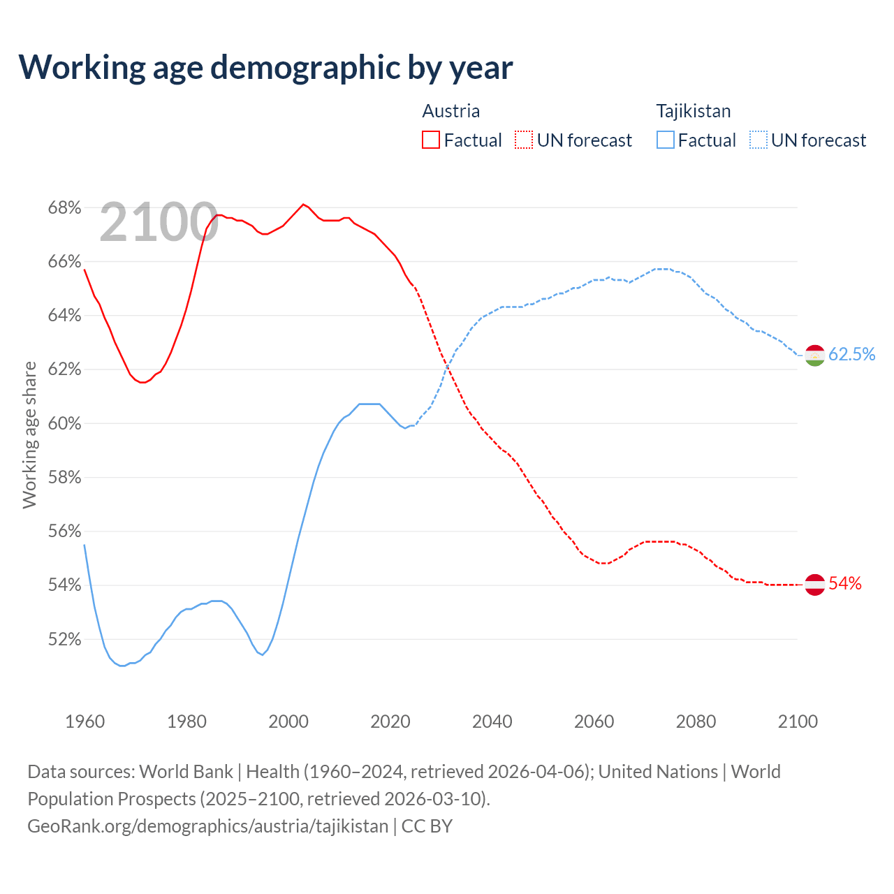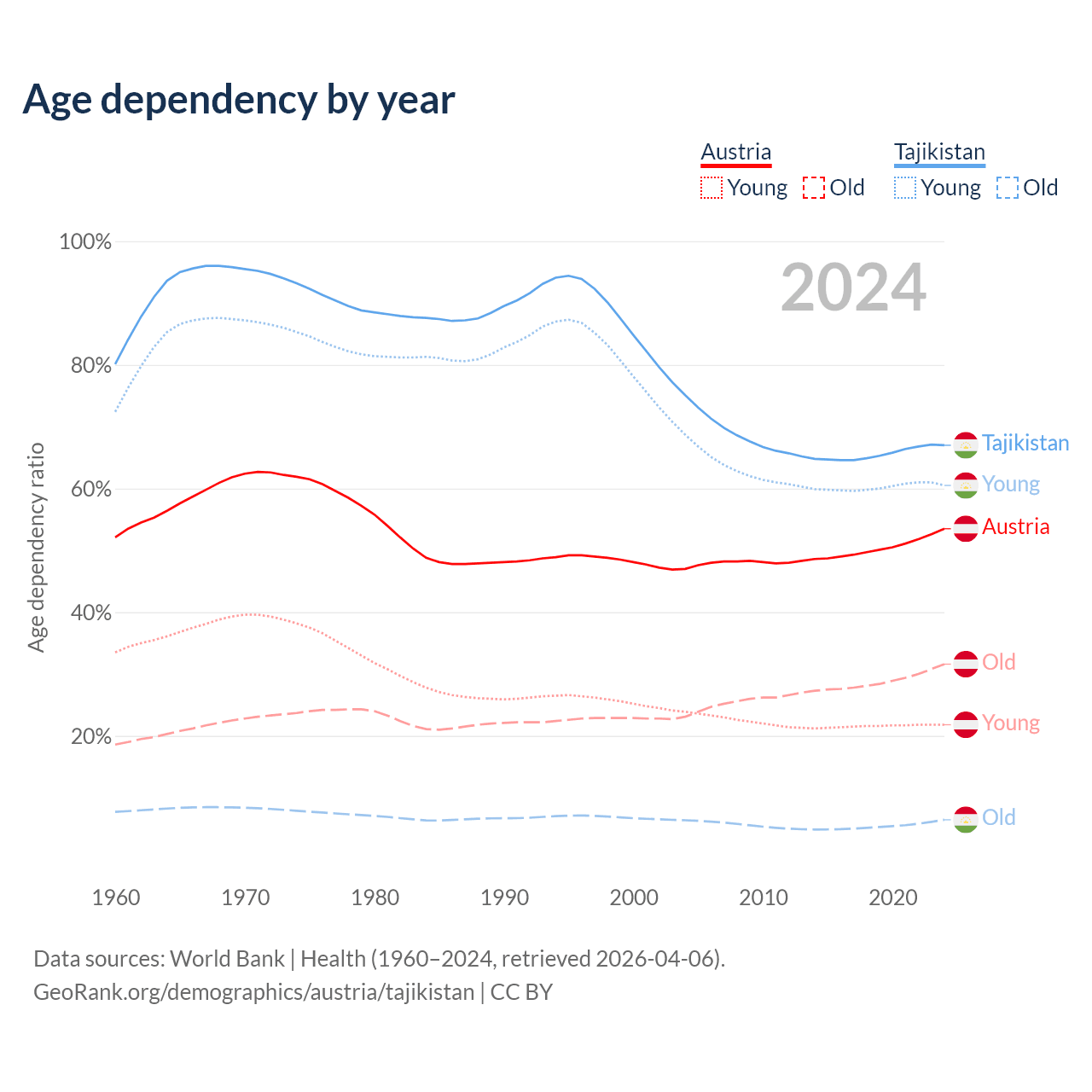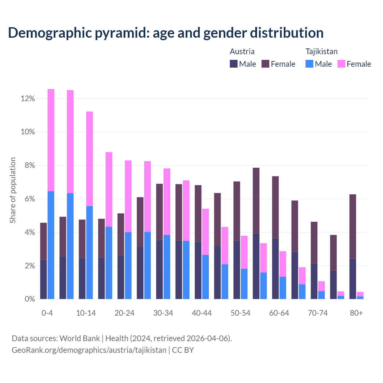 - The share of old-age demographic (65+) in Austria is 20.6% vs 3.85% in Tajikistan.
