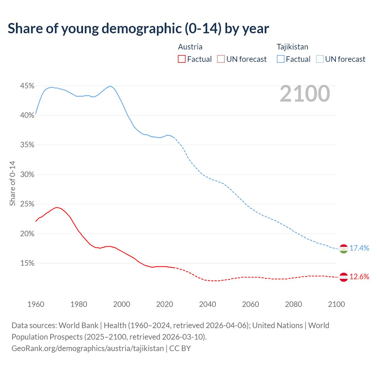 - The share of young demographic (0-15 years old) in Austria is 14.2% vs 36.3% in Tajikistan.