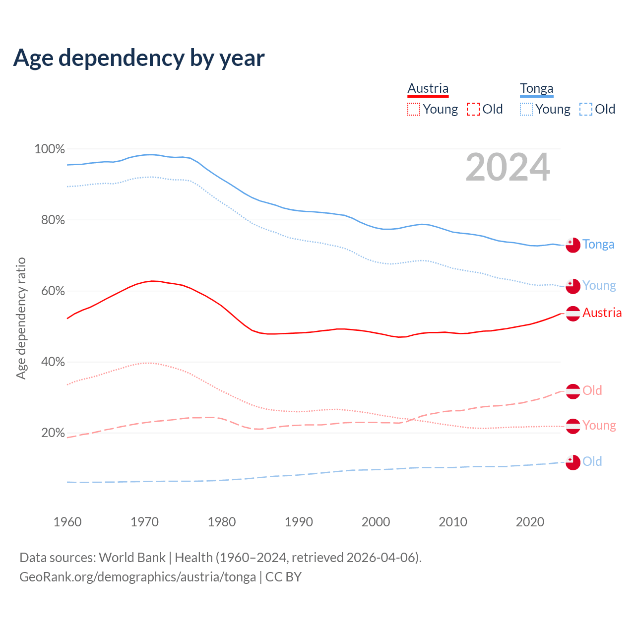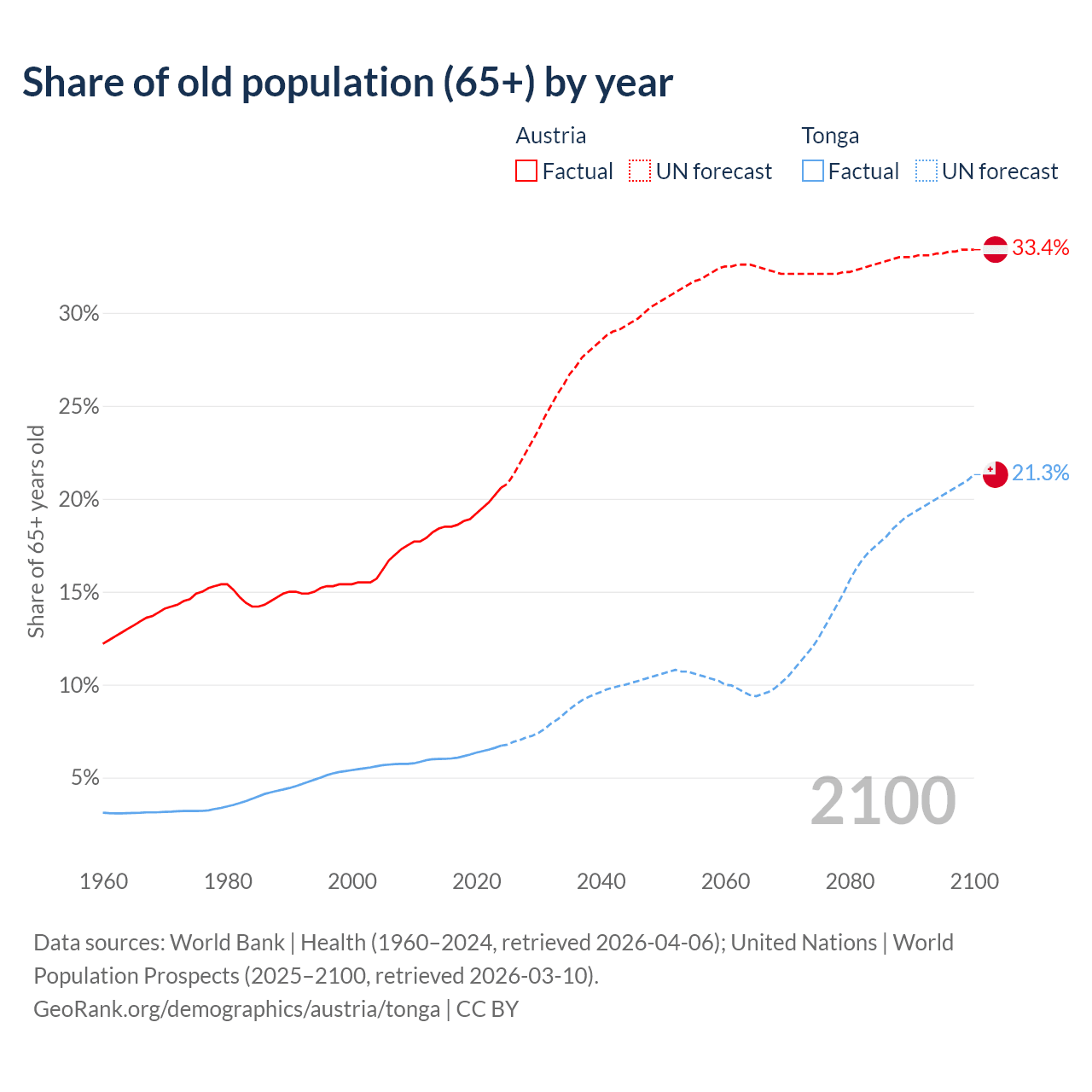 - The share of old-age demographic (65+) in Austria is 20.6% vs 6.72% in Tonga.
