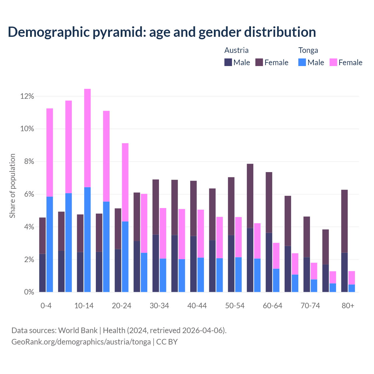 - As of 2026, the population of Austria is 9.16M vs 103K in Tonga - 88.7 times difference.