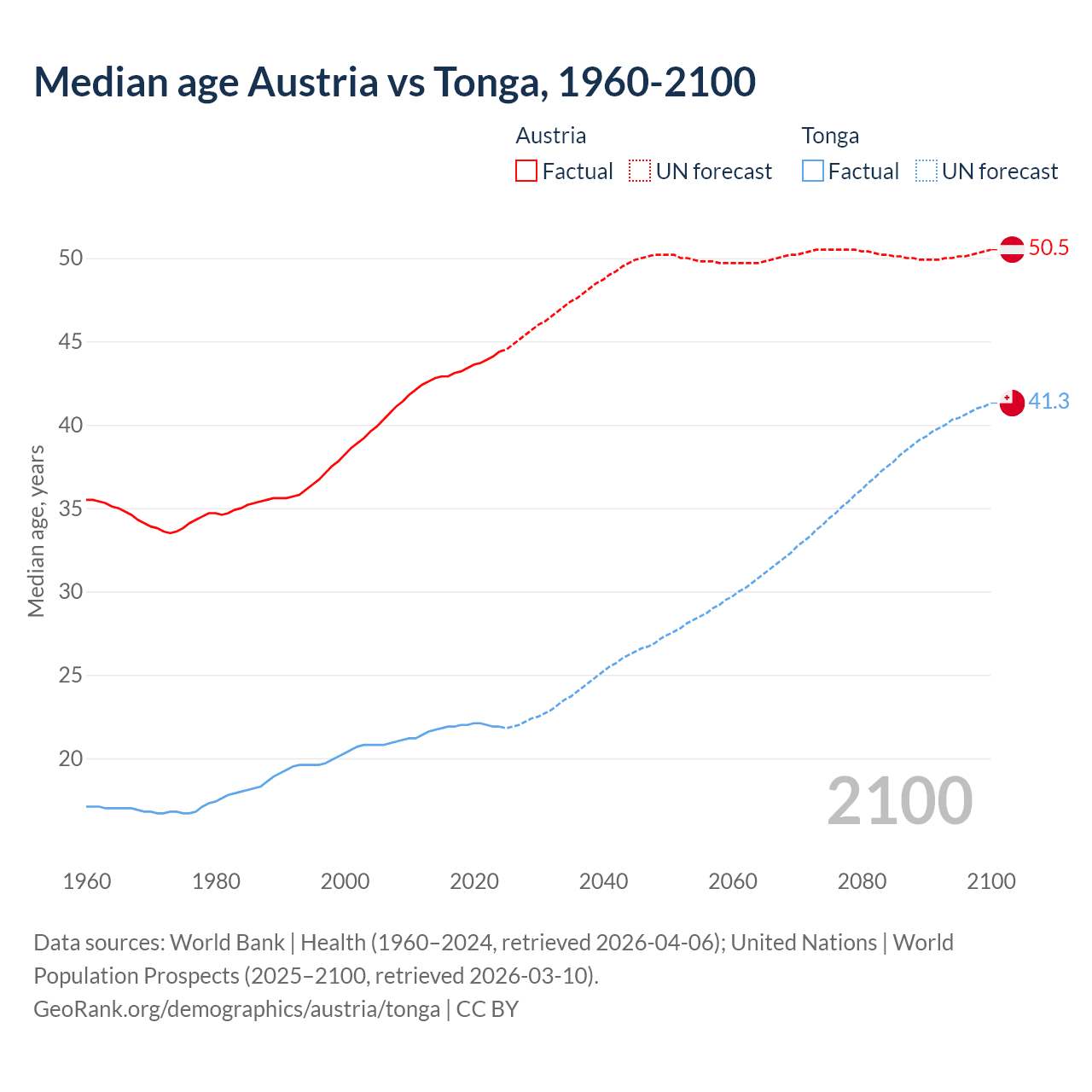 - Austria is ranked 19/196 by median age (oldest to youngest) vs 149/196 for Tonga.