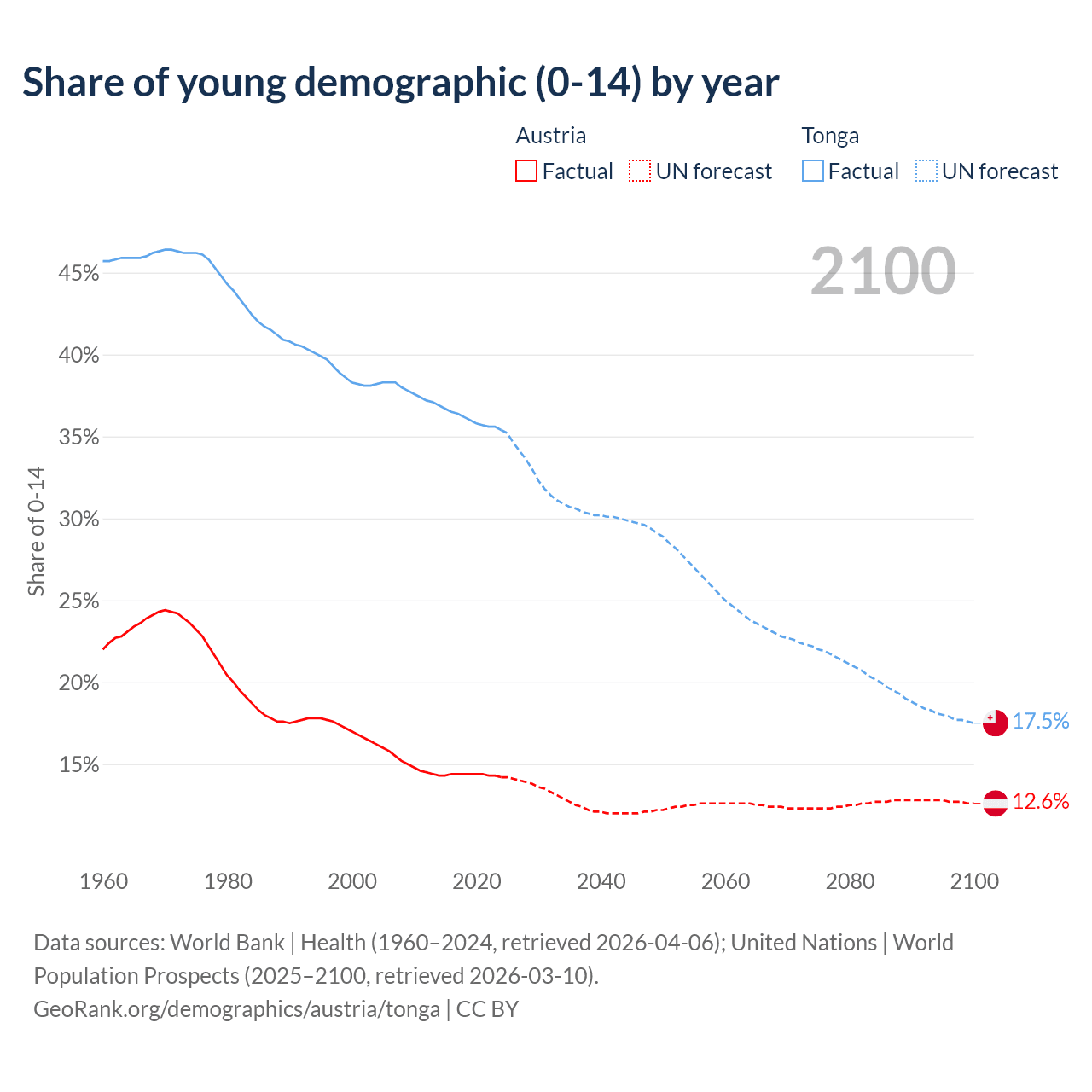 - The share of young demographic (0-15 years old) in Austria is 14.2% vs 35.4% in Tonga.