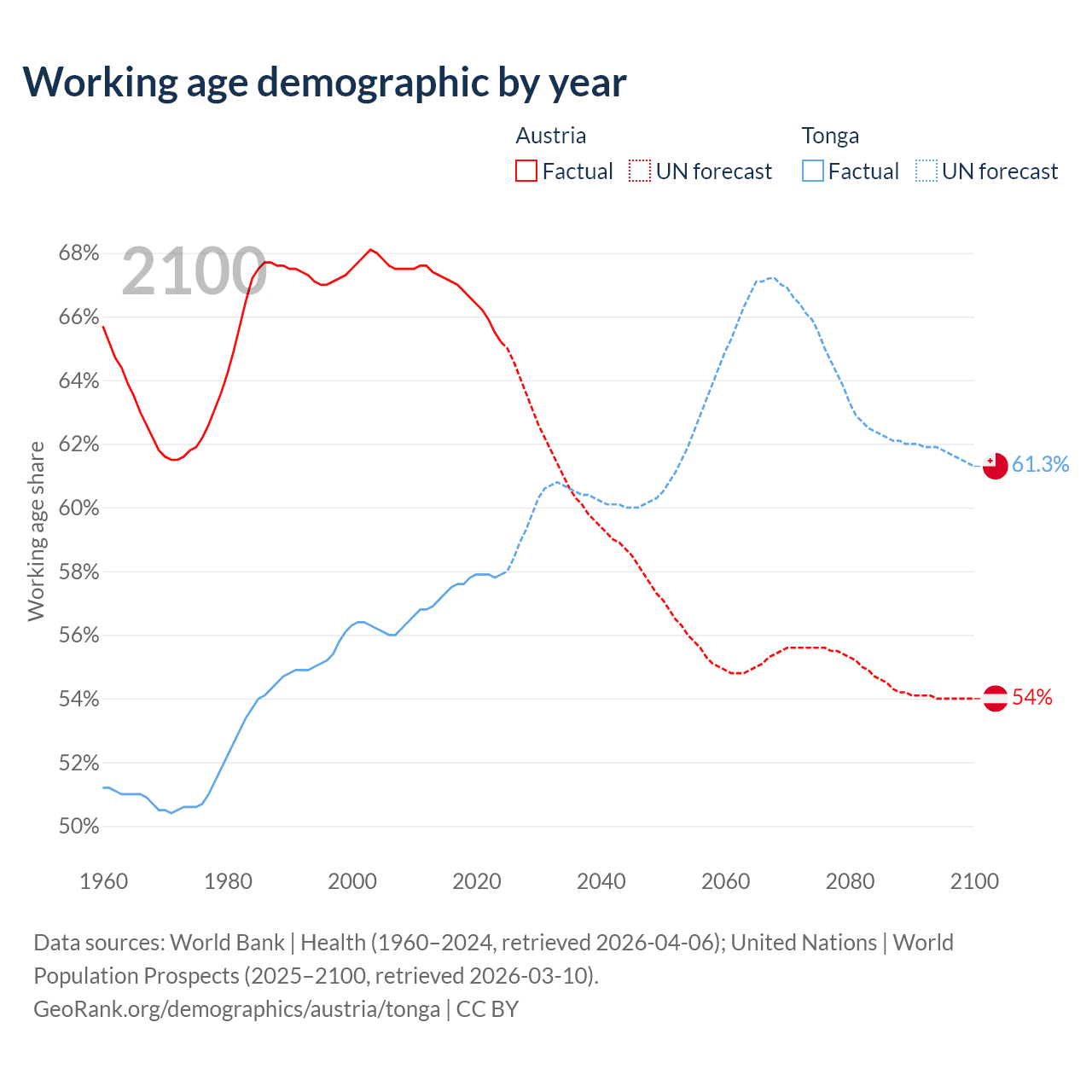 - Austria has 5.97M working age adults (aged 15-64) vs 59.8K in Tonga.