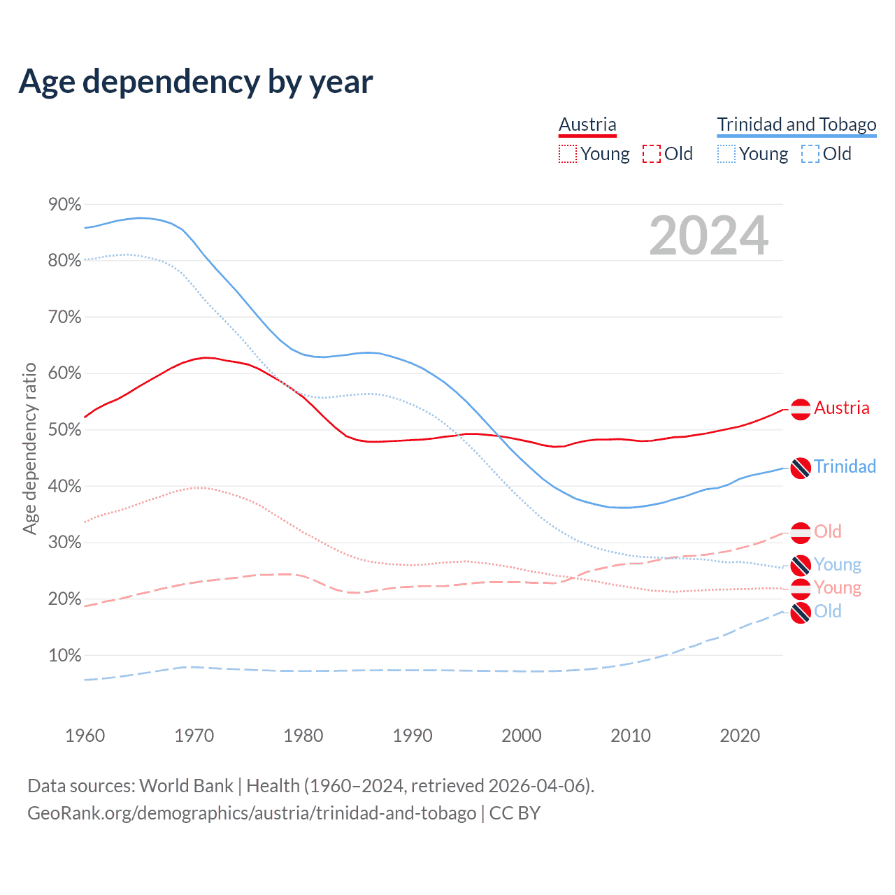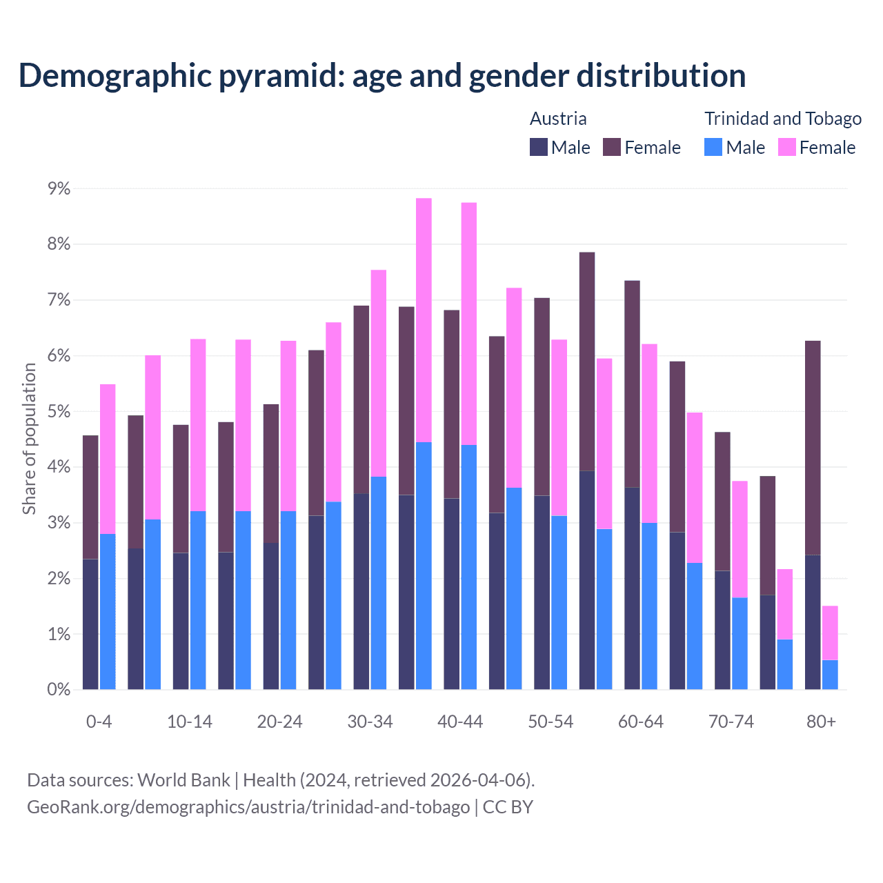 - Austria is ranked 19/196 by median age (oldest to youngest) vs 58/196 for Trinidad and Tobago.