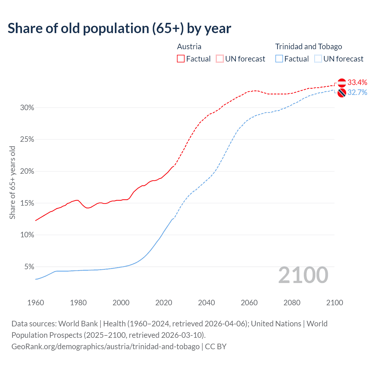 The share of older people aged 65 and over is 20.6% in Austria and 12.4% in Trinidad and Tobago. Life expectancy in Austria compared to Trinidad and Tobago .