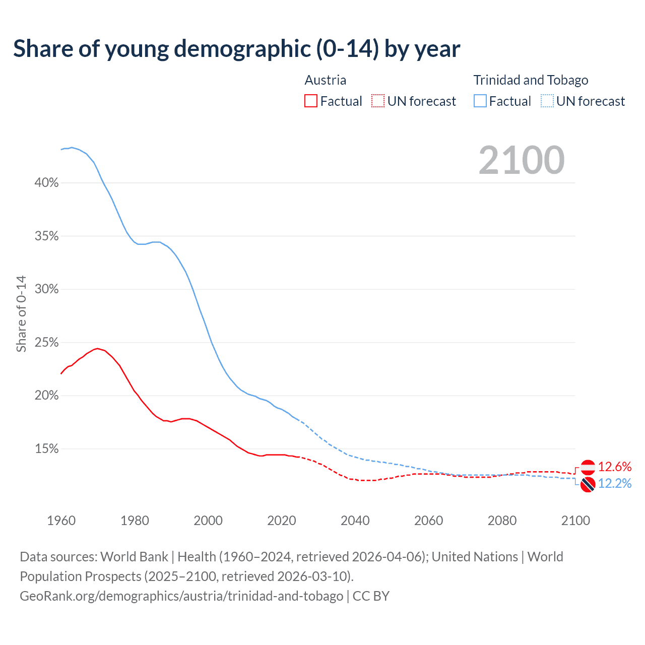 - The share of young demographic (0-15 years old) in Austria is 14.2% vs 17.8% in Trinidad and Tobago.